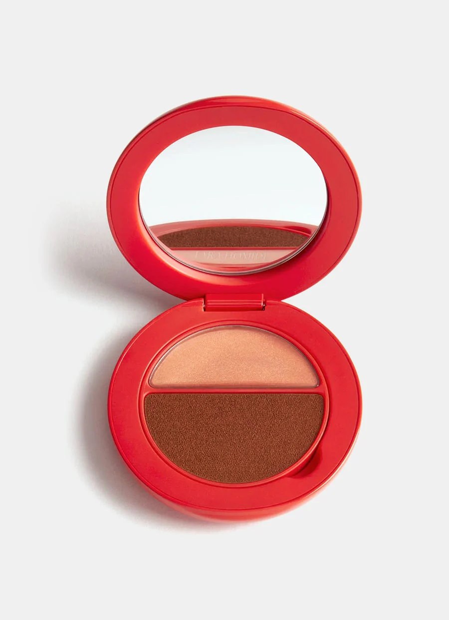 Corrector de Fara Homidi con híbrido crema-polvo Smooth Veil Soft e iluminador traslúcido Shine Baume. Smooth Veil Soft Matte crea una piel aterciopelada y transpirable, mientras que Shine Baume proporciona un brillo luminoso. Recargable con espejo en la tapa interior. Vegano, no testado en animales. Hecho en Italia.