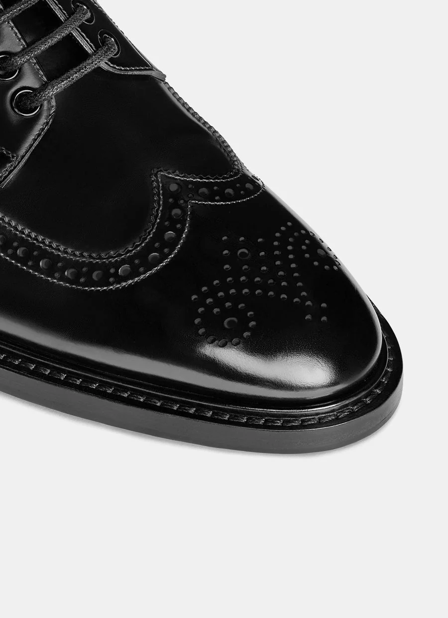 Zapatos Derby de Celine en piel de toro pulida y construcción Blake. Presentan forma de punta de almendra, nueva perforación Triomphe en la puntera, cordones de algodón encerado, plantilla y suela de cuero. Forro de piel de becerro. Hecho en Italia. Talla normal, elige tu talla habitual. Tallaje italiano.