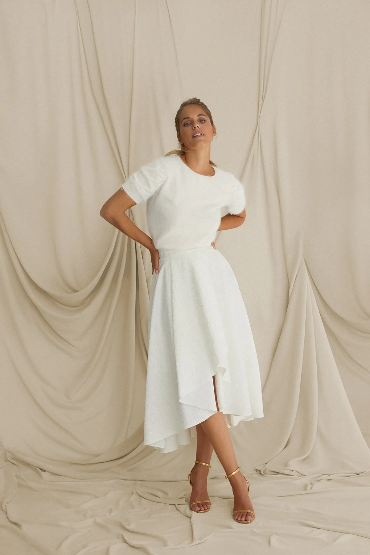 Nuestra falda Rania esta confeccionada en jacquard bordado que le da un toque super elegante y rico en texturas y matices.