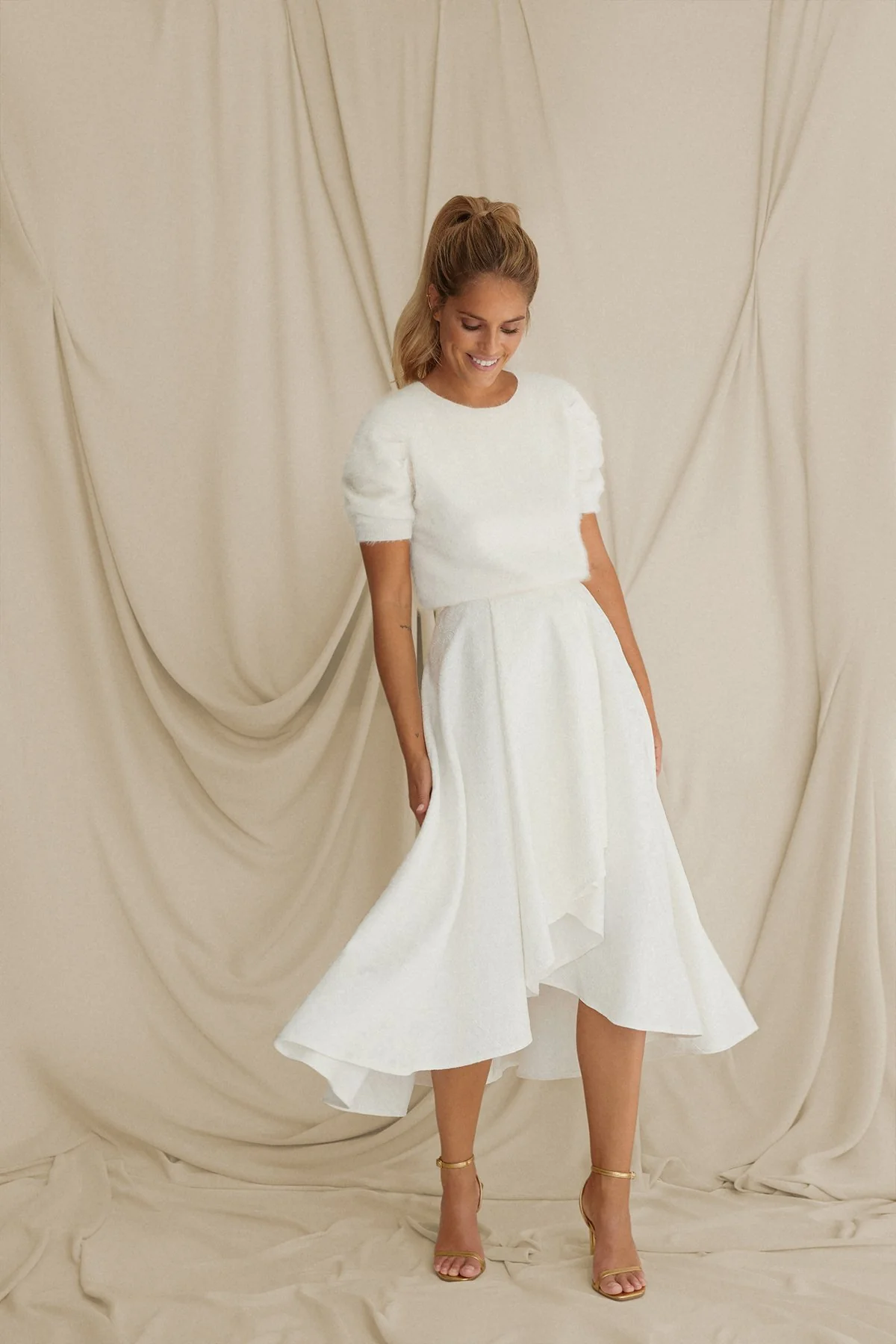 La falda de novia Rania tiene mucho volumen y pliegues con frontal asim茅trico para darle m谩s volumen y movimiento a la prenda.