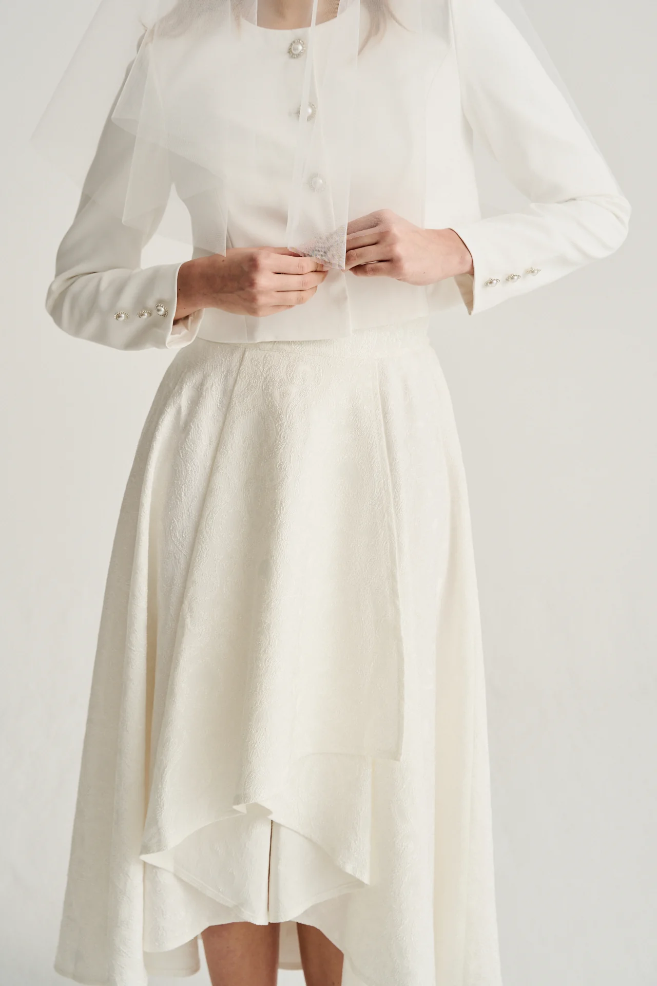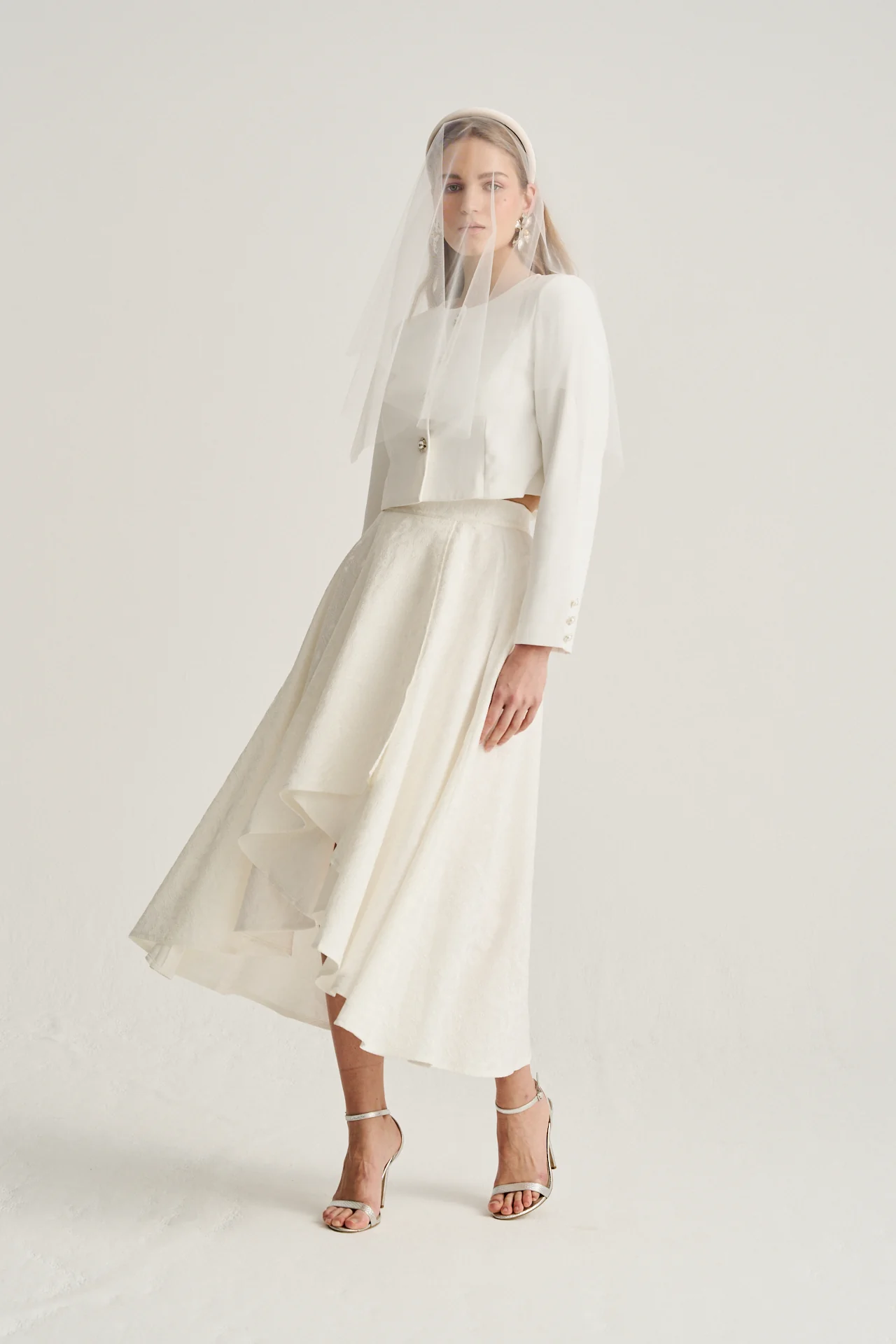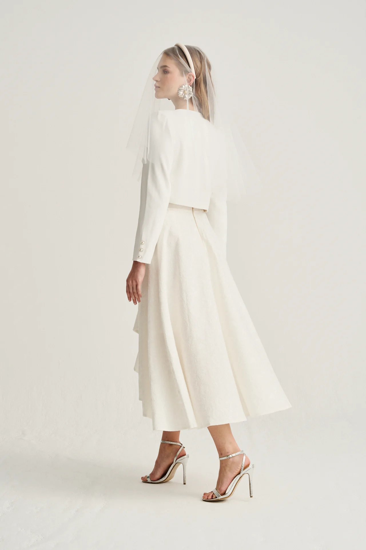Combina la falda Rania con nuestra chaqueta de novia Giada para un look nupcial diferente, moderno y lleno de estilo. Ideal para bodas civiles o ceremonias en las que quieras destacar con una propuesta única.