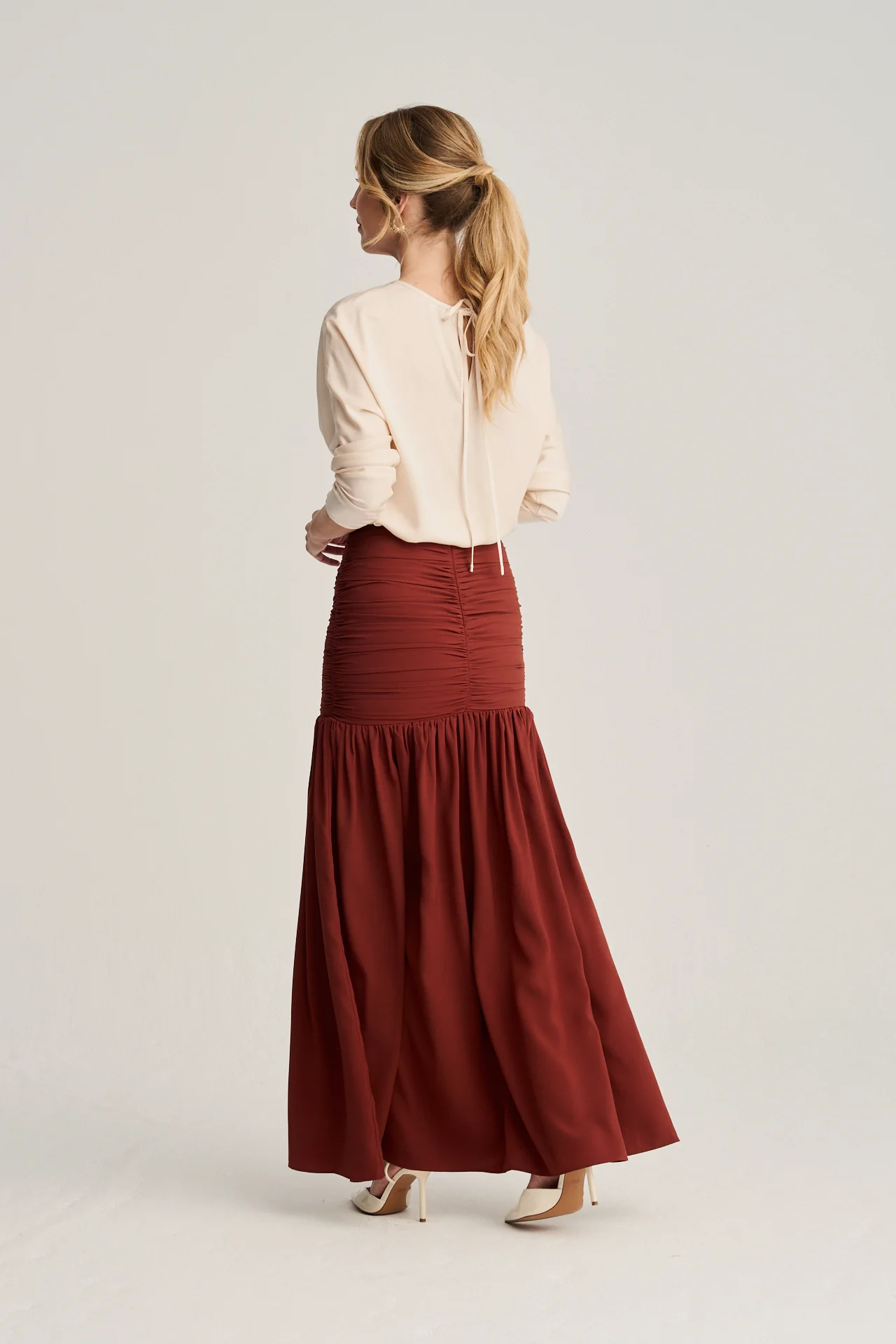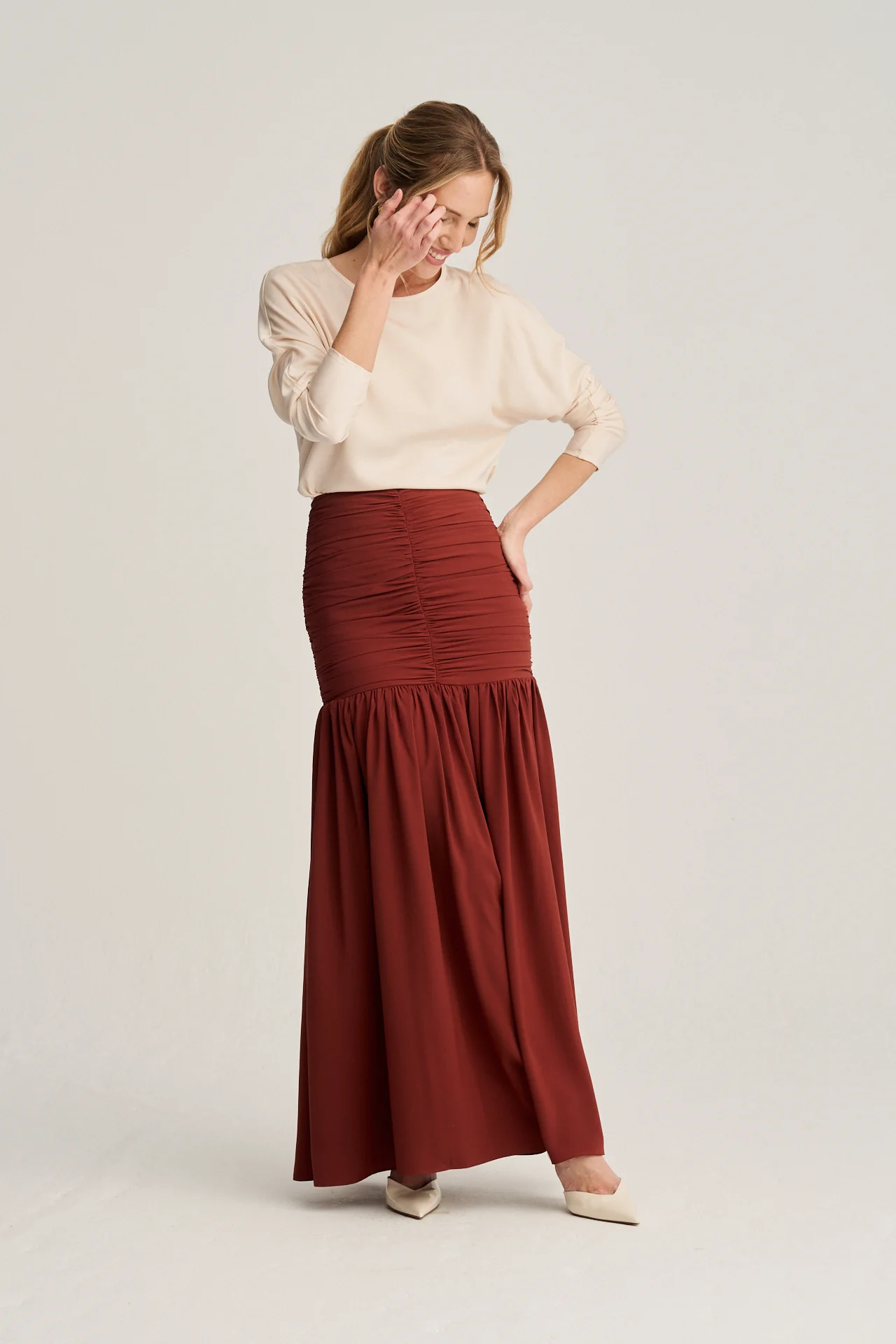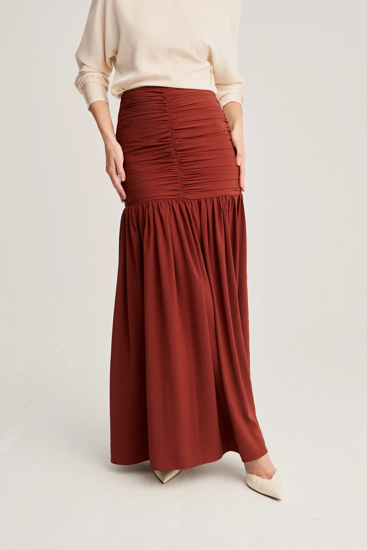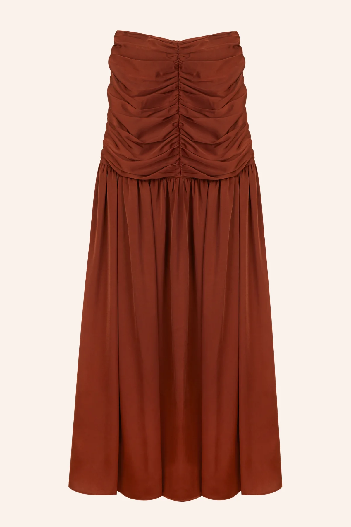 Descubre la belleza de esta falda larga en color praliné, diseñada para combinar sofisticación y feminidad. Su corte único realza la figura con detalles cuidadosamente confeccionados, convirtiéndola en una pieza clave para cualquier evento especial o look distinguido.