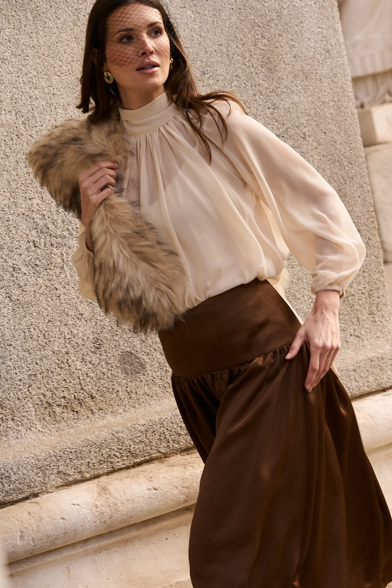 Aporta un toque de elegancia contempor谩nea a tu guardarropa con esta falda midi en color chocolate, confeccionada en un tejido tipo tafet谩n que combina textura y brillo sutil para un look sofisticado y femenino.