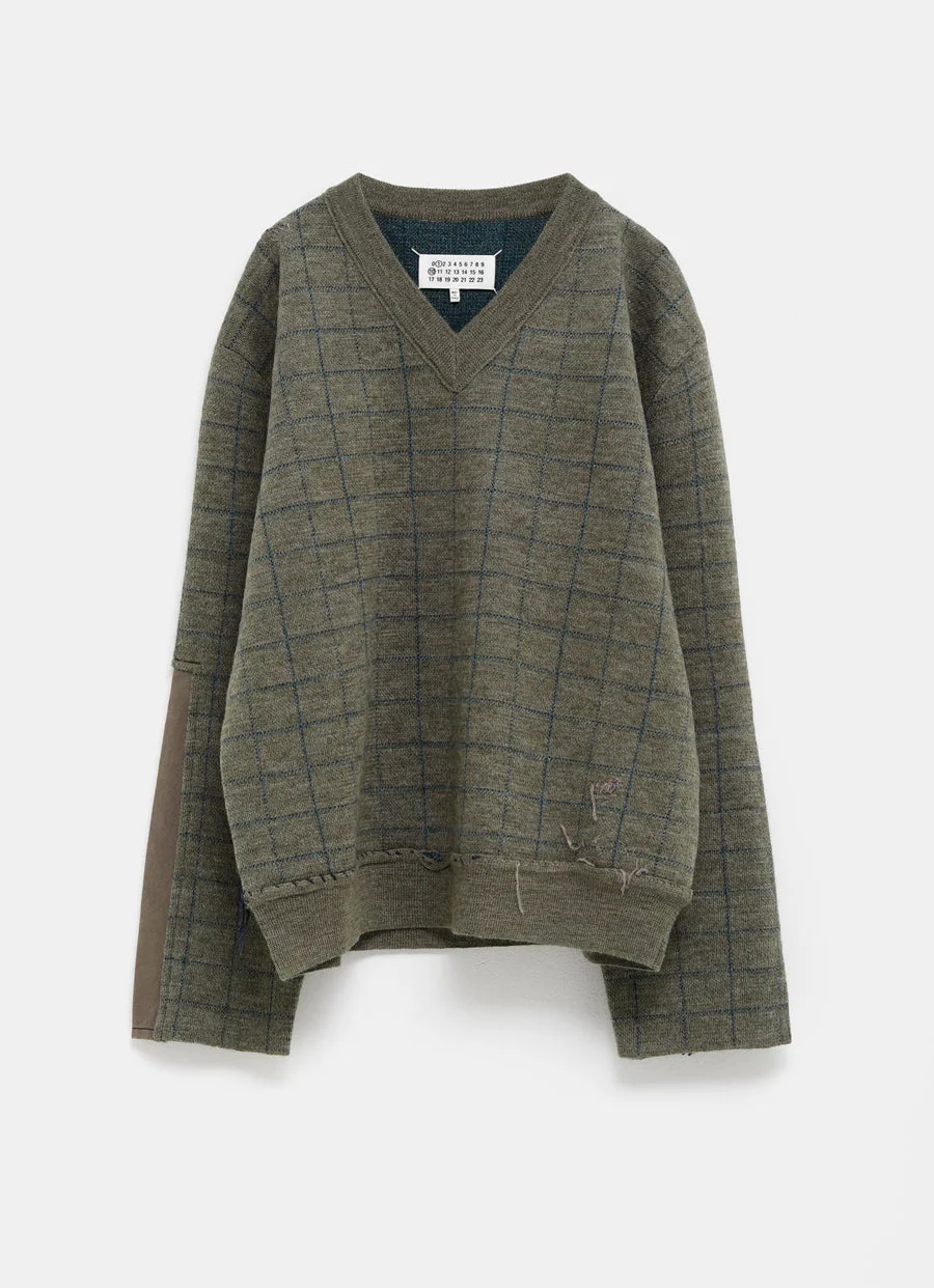 Jersey de Maison Margiela en punto de lana con detalles deshilachados. Manga larga con parches, cuello de pico y elásticos de canalé. Detalle de cuatro puntadas en la parte trasera. Corte holgado. Hecho en Italia. Talla normal, elige tu talla habitual. Tallaje estándar para hombre.