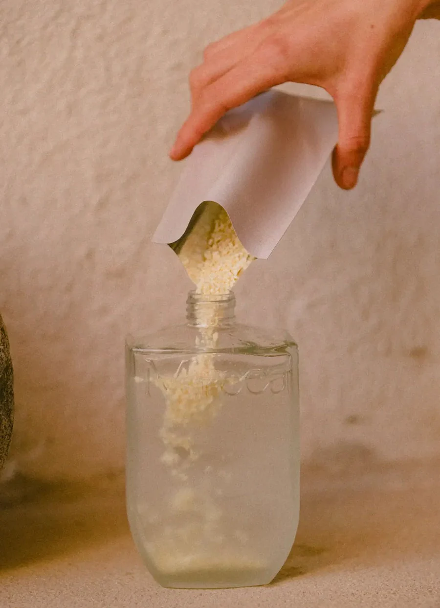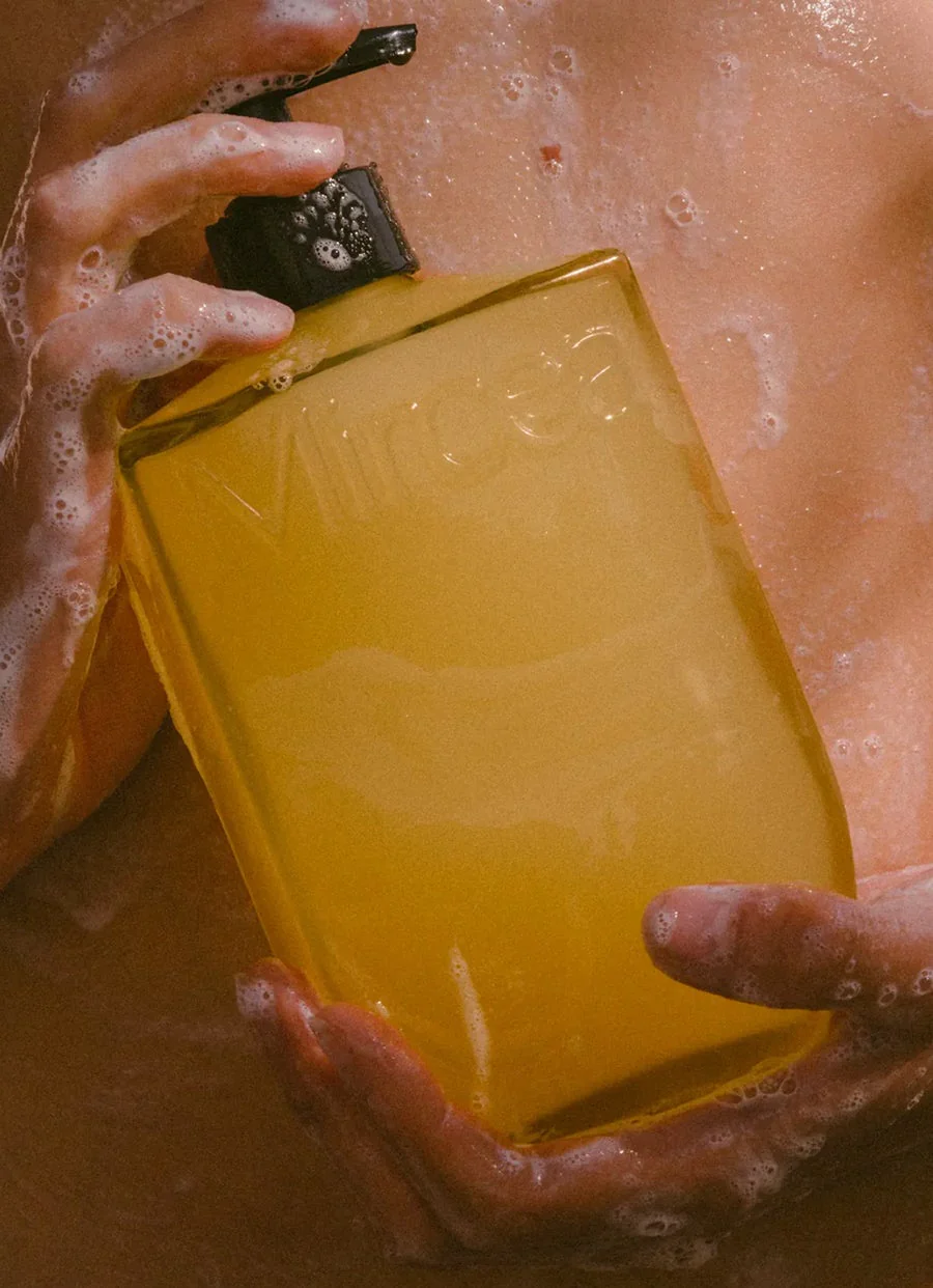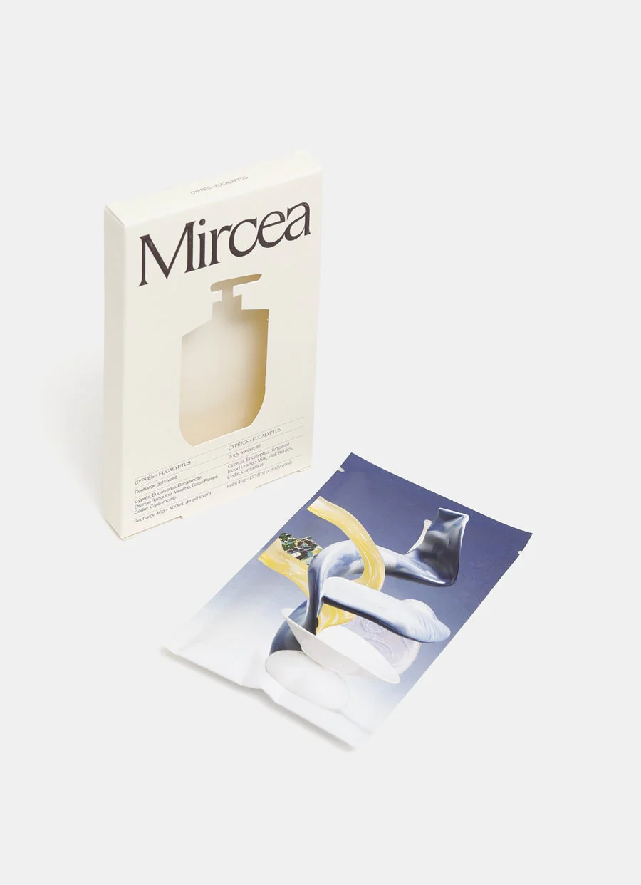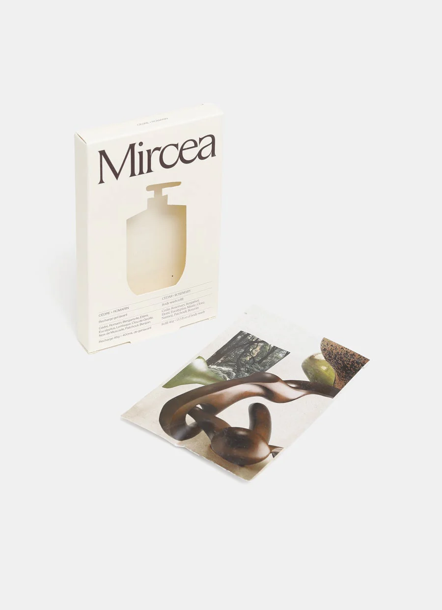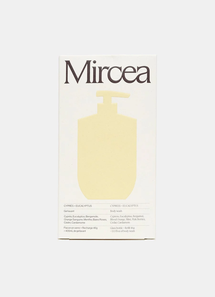 Juego de jabón de baño de Mircea que incluye una botella de vidrio rellenable de 400 ml y una fórmula de cristales solubles. Fórmula de aceites esenciales, perfume 100% natural, fórmula vegana sin ingredientes sintéticos agresivos ni sulfatos. Modo de empleo: llenar la botella con agua hasta el logotipo, verter los gránulos, cerrar y agitar. Hecho en Grasse, Francia. Incluye: botella de vidrio de 400 ml con dosificador y recambio de 46 g.