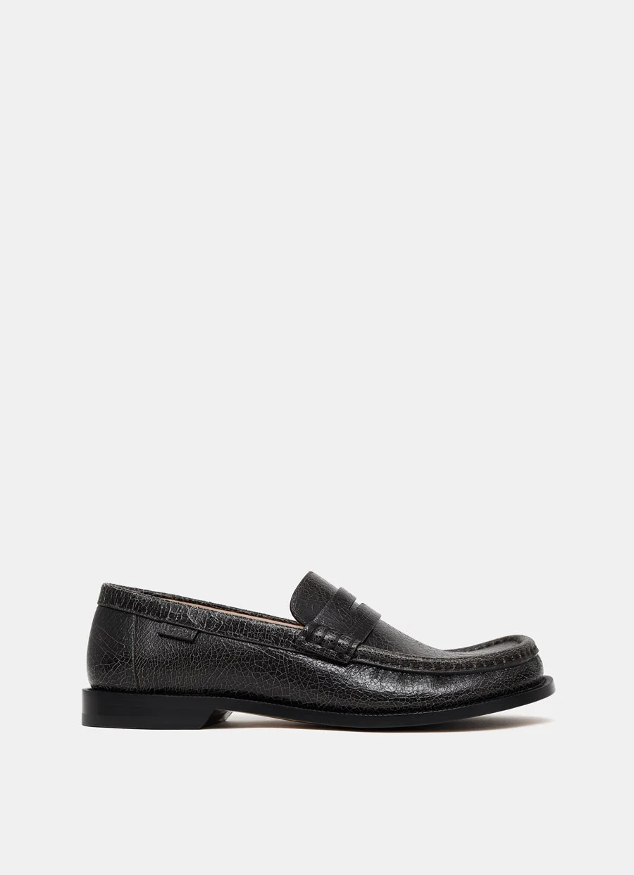 Mocasín de Loewe con inspiración vintage, en piel de ternera agrietada con puntera asimétrica y redonda. Pala alta, pespuntes a mano, suela y plantilla en piel. Tacón de 2 cm. Hecho en Italia. Talla normal, escoge tu talla habitual. Tallaje UE para hombre.