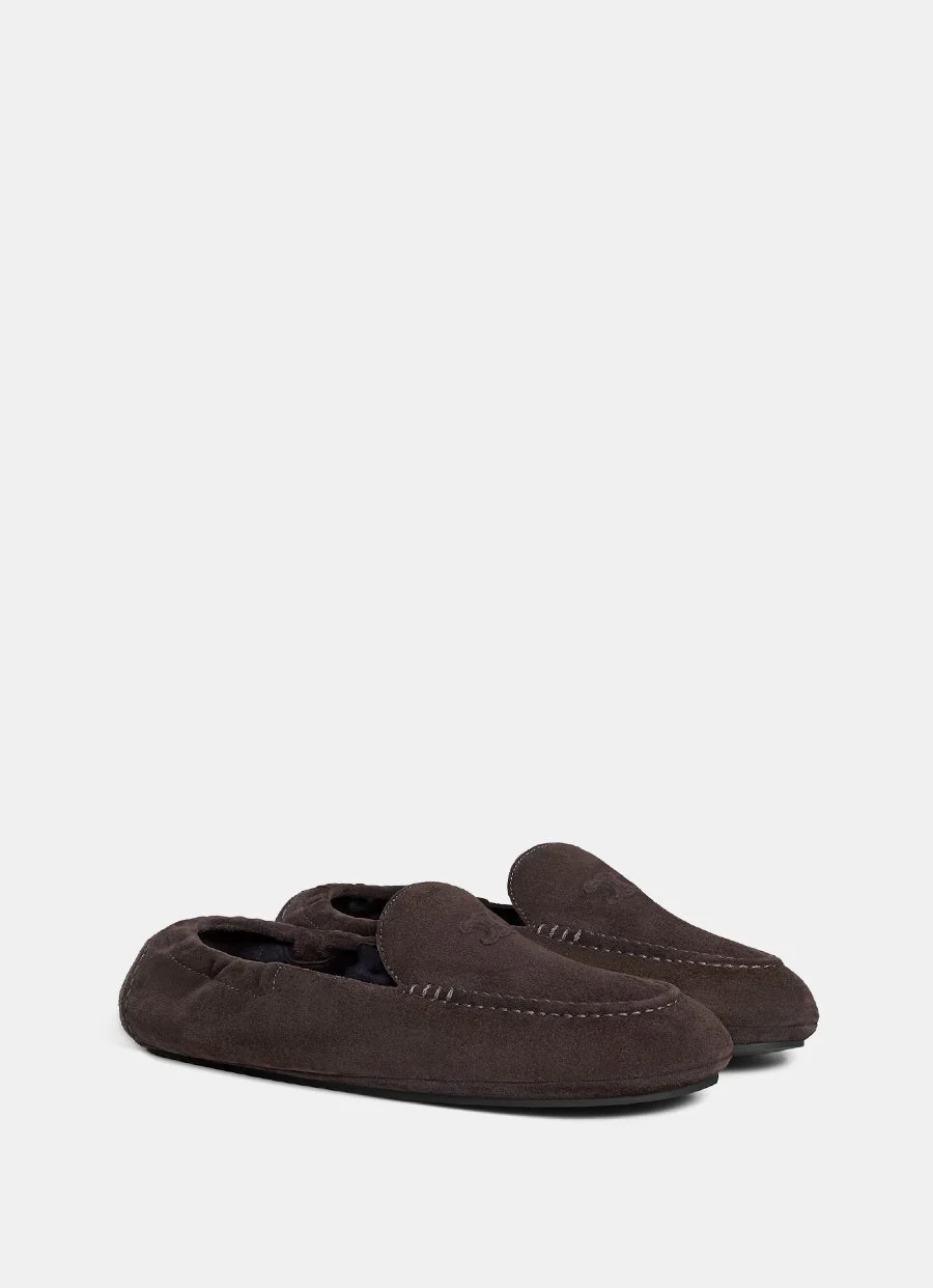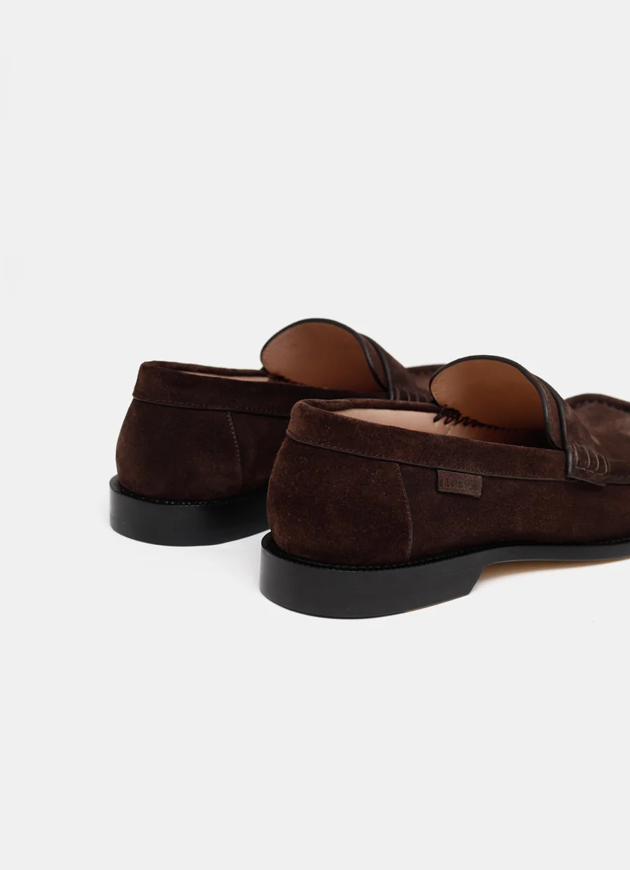 Mocasín de Loewe en ante de piel de ternera con puntera asimétrica y redonda. Pala alta, pespuntes a mano, suela y plantilla en piel. Tacón de 2 cm. Hecho en Italia. Talla normal, escoge tu talla habitual. Tallaje UE para hombre.