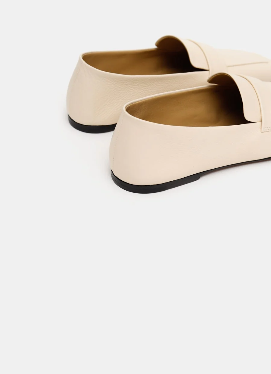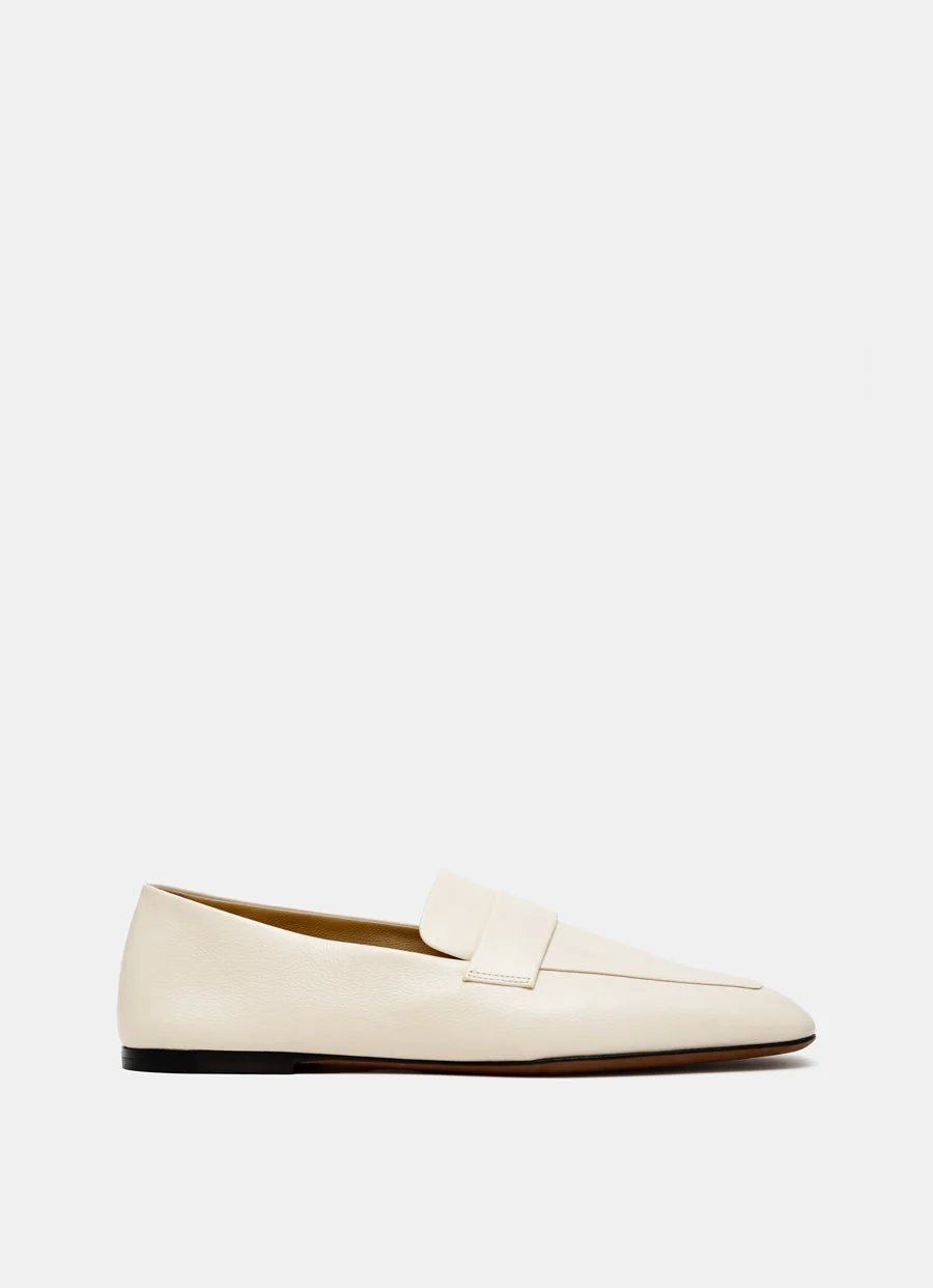 Mocasín minimalista de The Row en piel de becerro granulada con suela cuadrada, tira cosida y suela de cuero. Hecho en Italia. Talla normal, elige tu talla habitual. Tallaje UE para mujer.