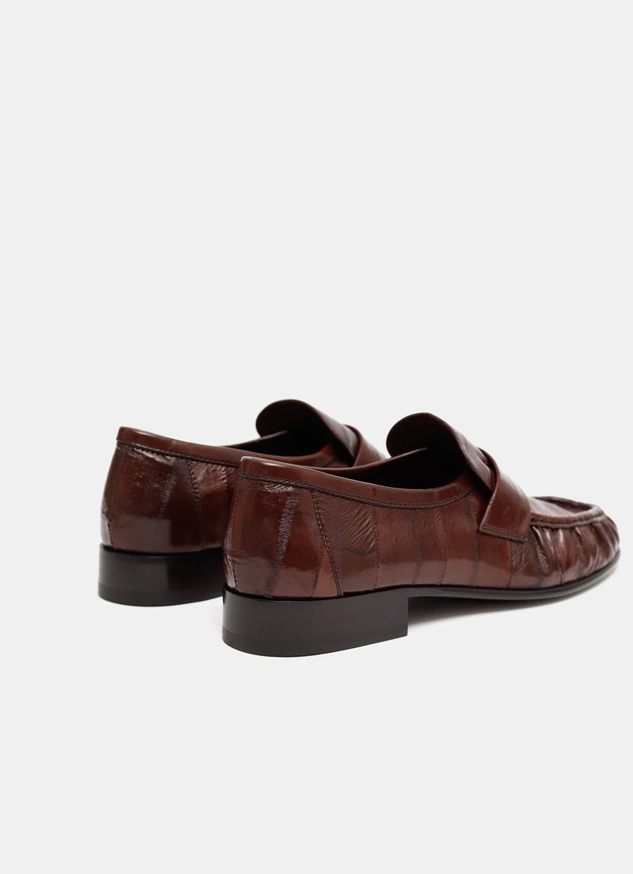 Mocasín suave de The Row realizado con piel de anguila con efecto plisado natural, pespuntes a mano, tacón de 2 cm y suela de piel. Hecho en Italia. Talla normal, elige tu talla habitual. Tallaje UE para mujer.