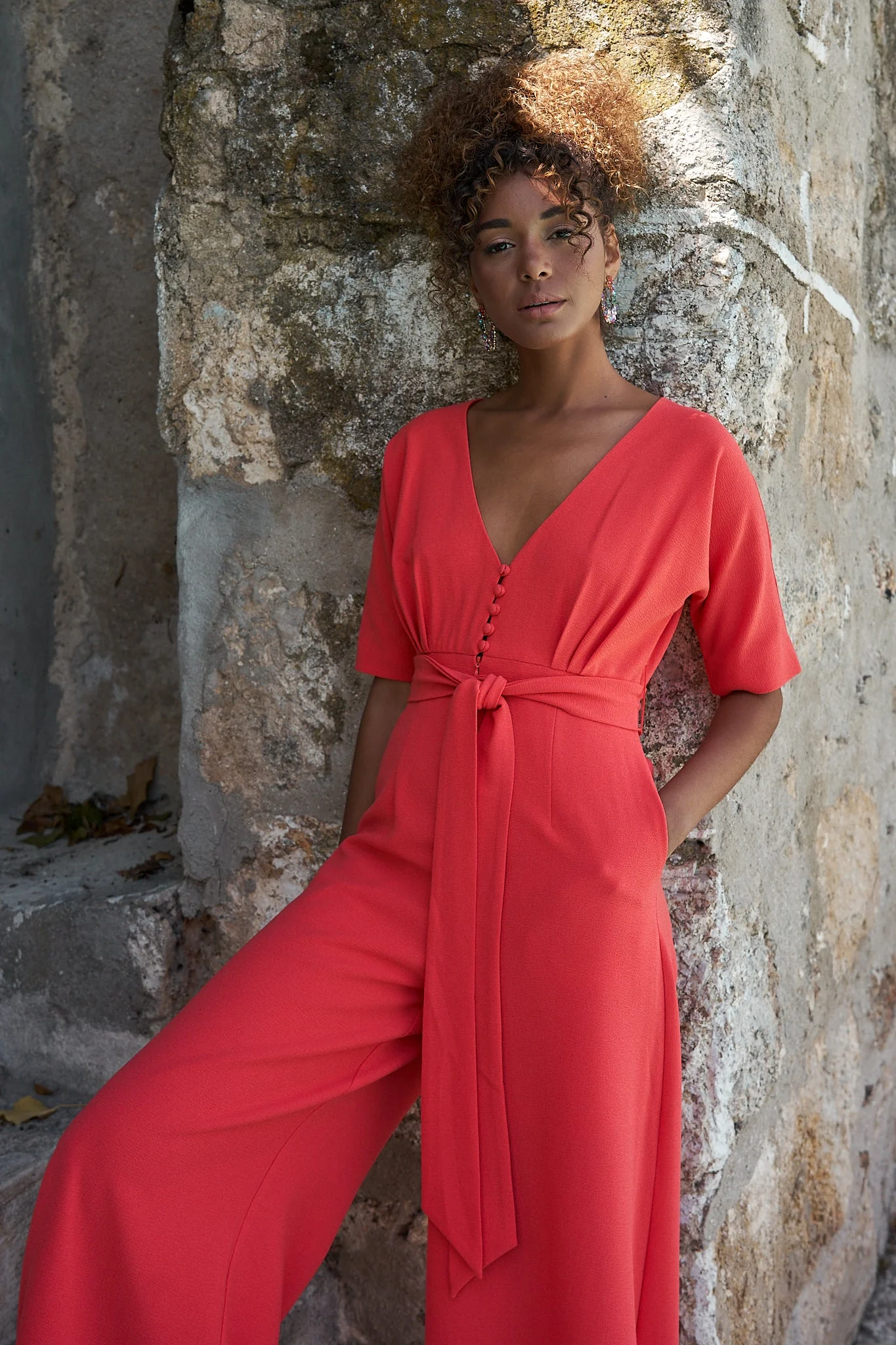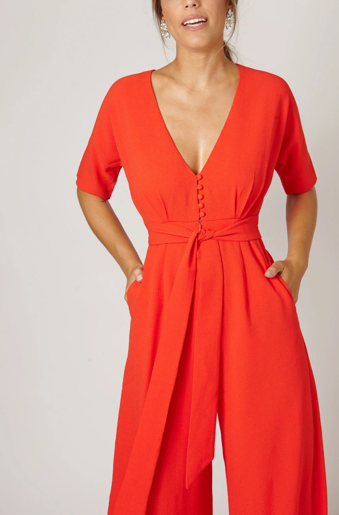 Este mono de fiesta es la opci贸n ideal para destacar en cualquier evento formal. Confeccionado en crepe de alta calidad, presenta un escote en pico que a帽ade un toque de sofisticaci贸n y feminidad.