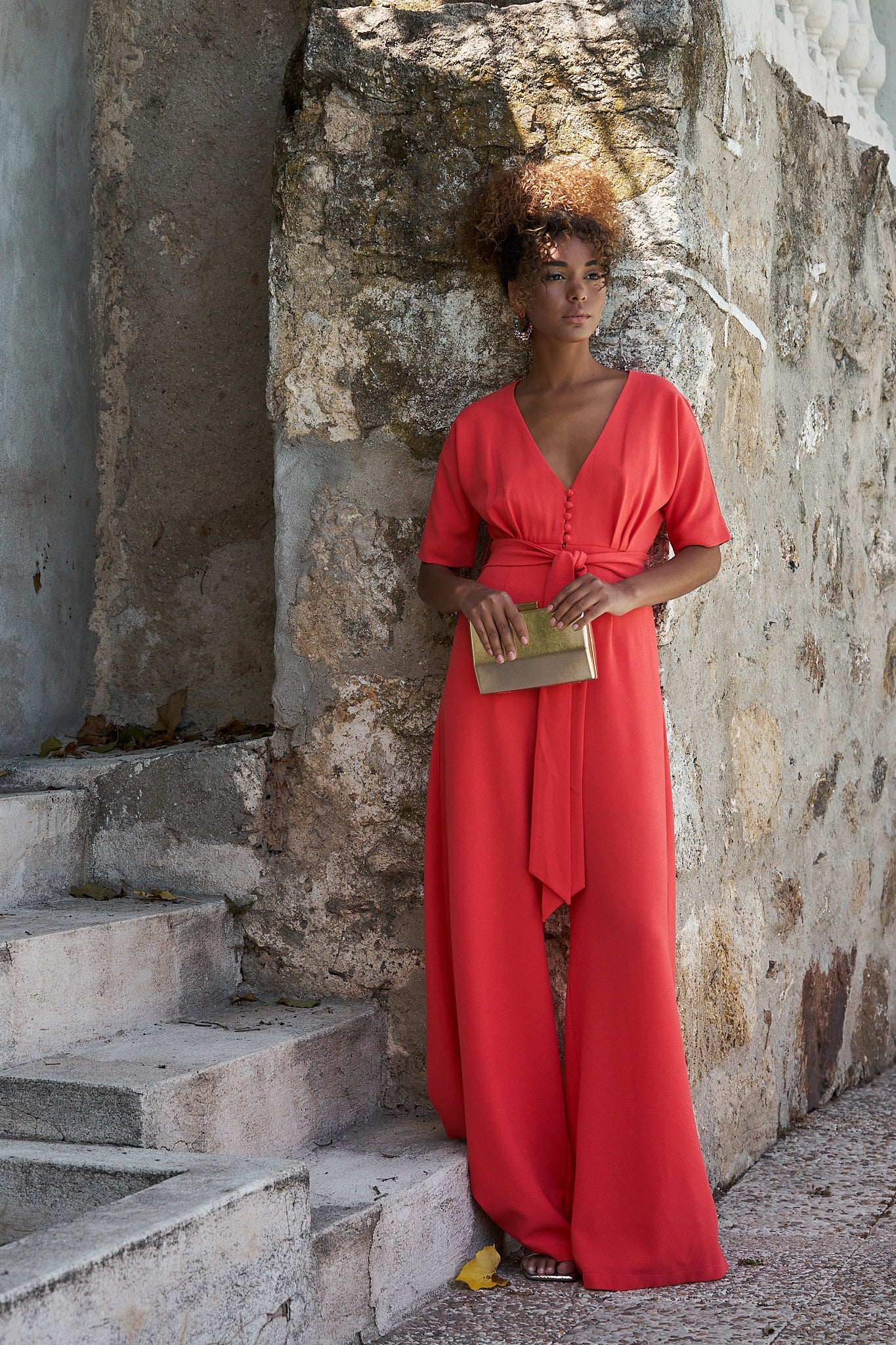 Mono de fiesta elegante con escote en pico y pantal贸n palazzo.