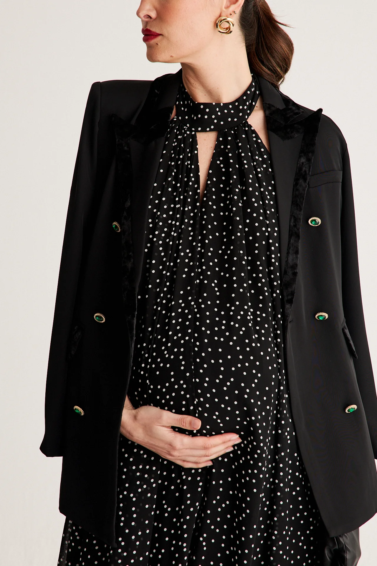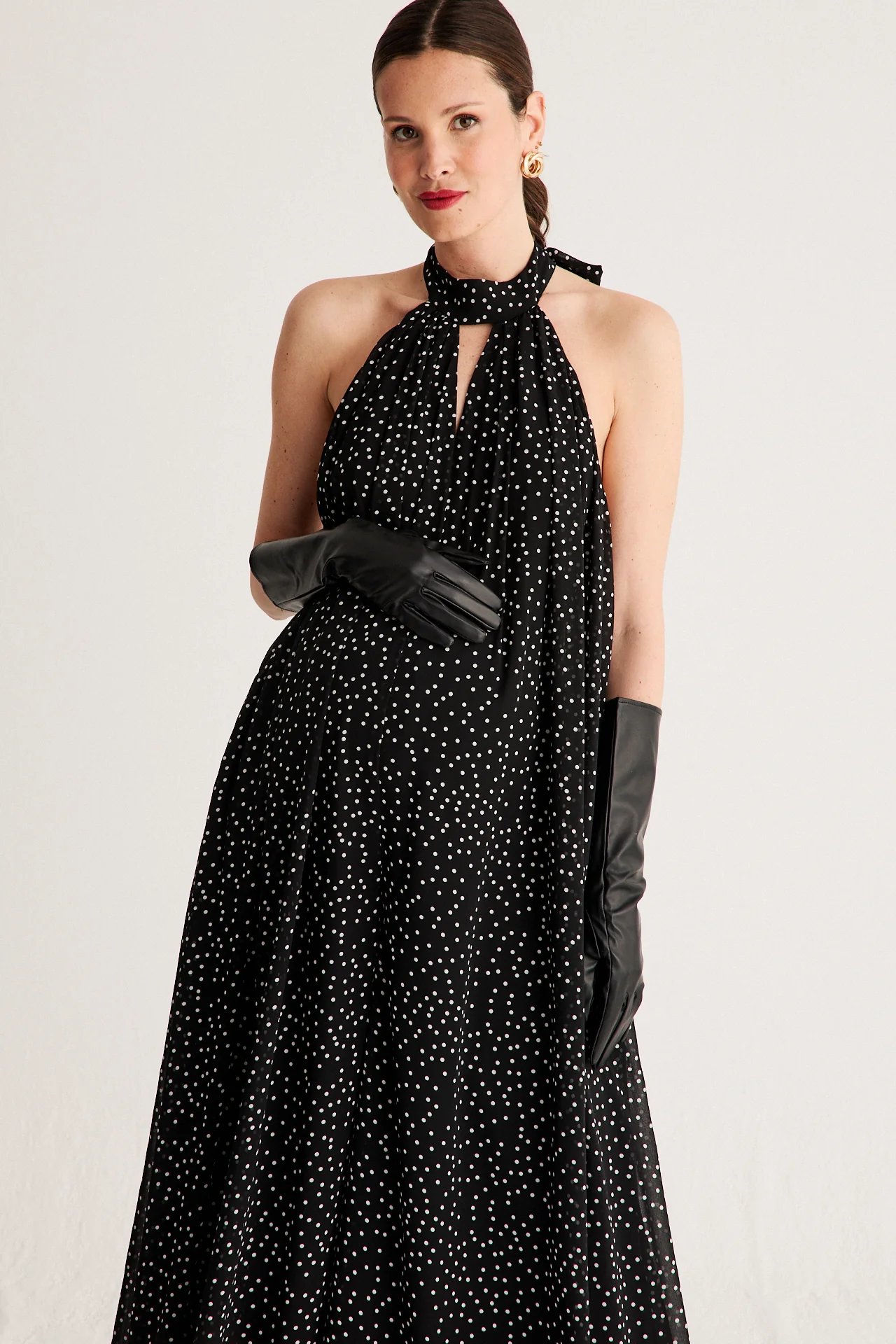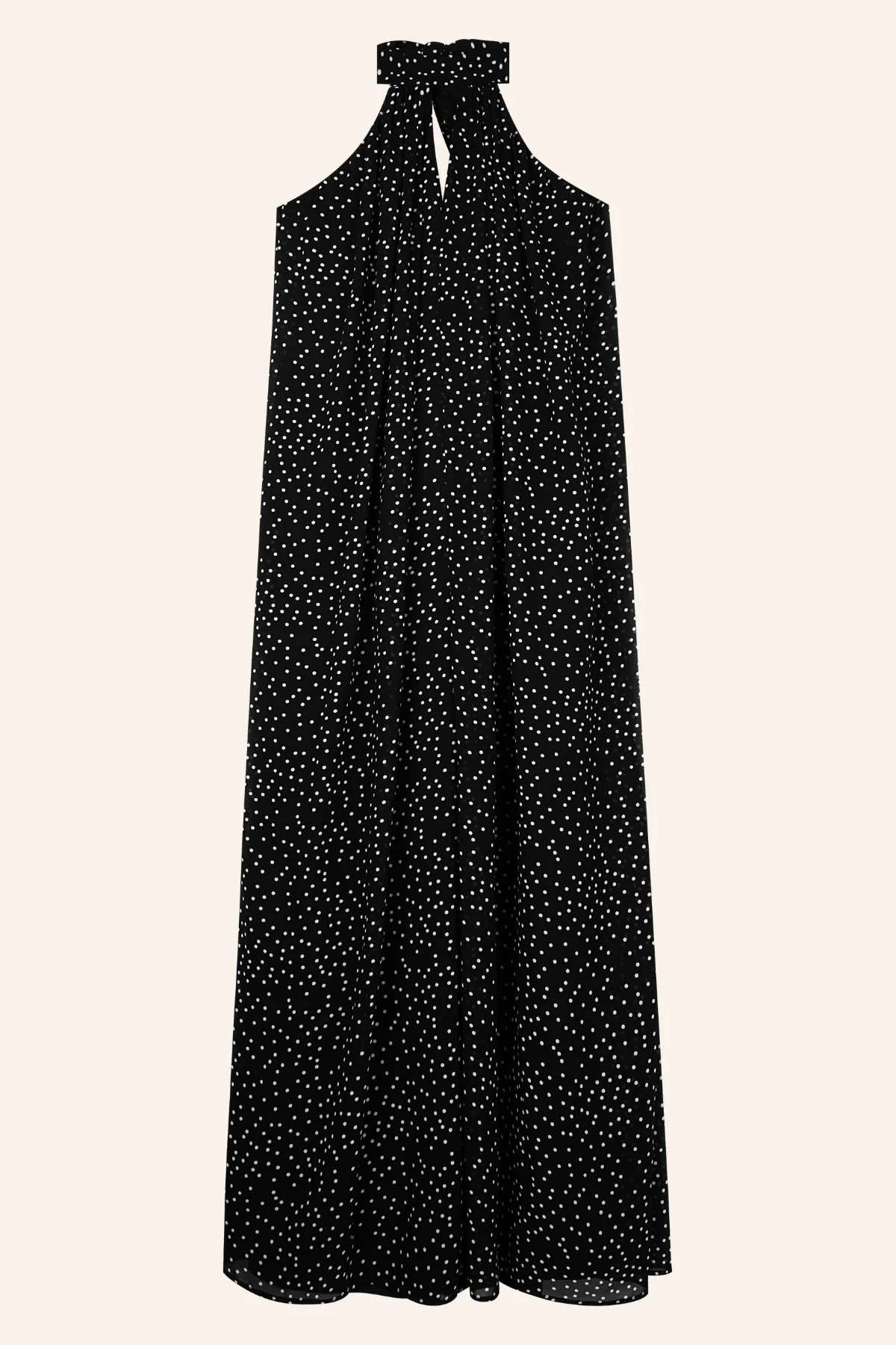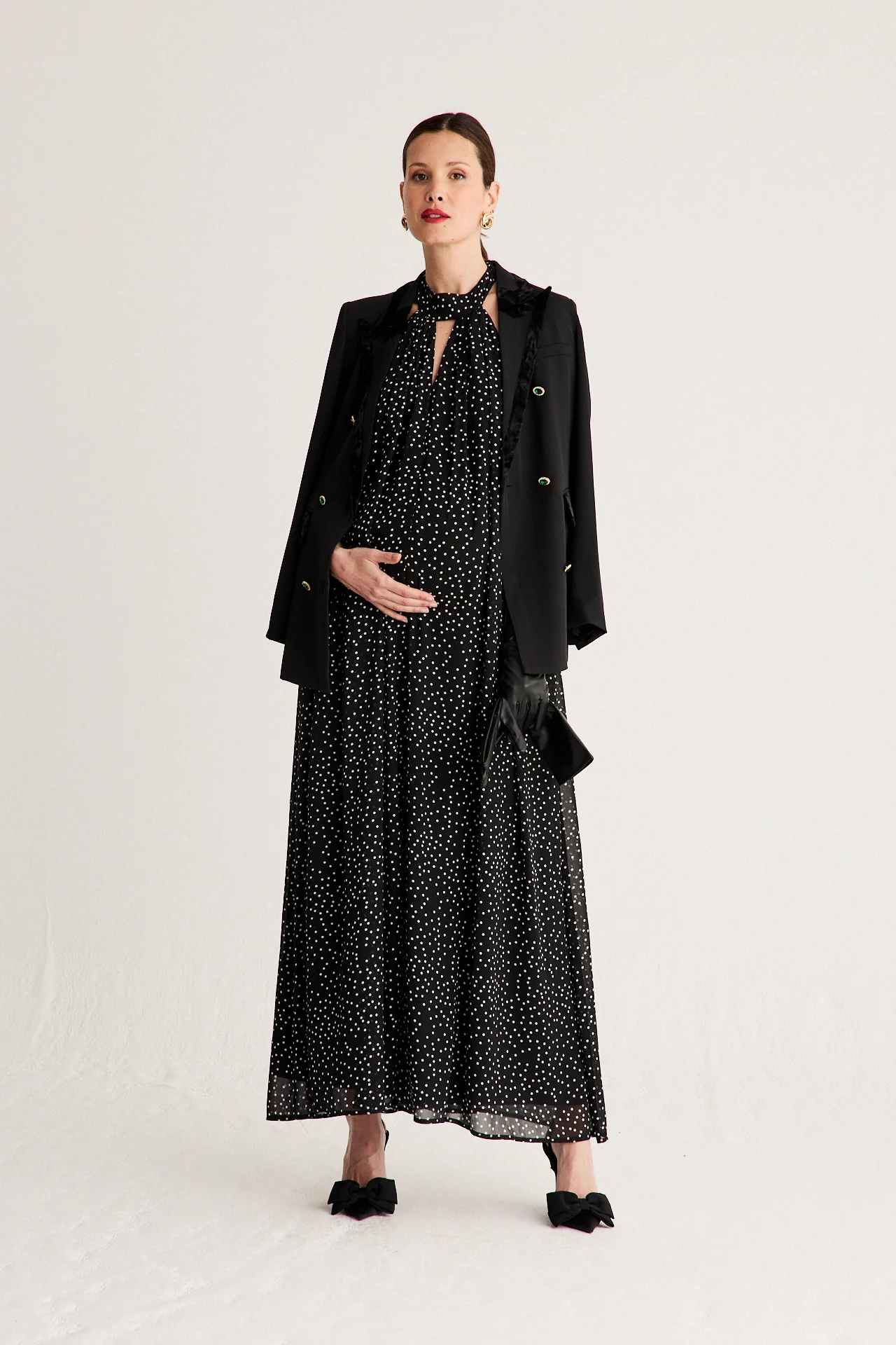 Un mono largo confeccionado en gasa ligera con estampado de micro lunares blancos sobre fondo negro. Su silueta fluida, con escote halter y espalda descubierta, envuelve el cuerpo con naturalidad, acompañando el movimiento y adaptándose cómodamente a las distintas etapas del embarazo.