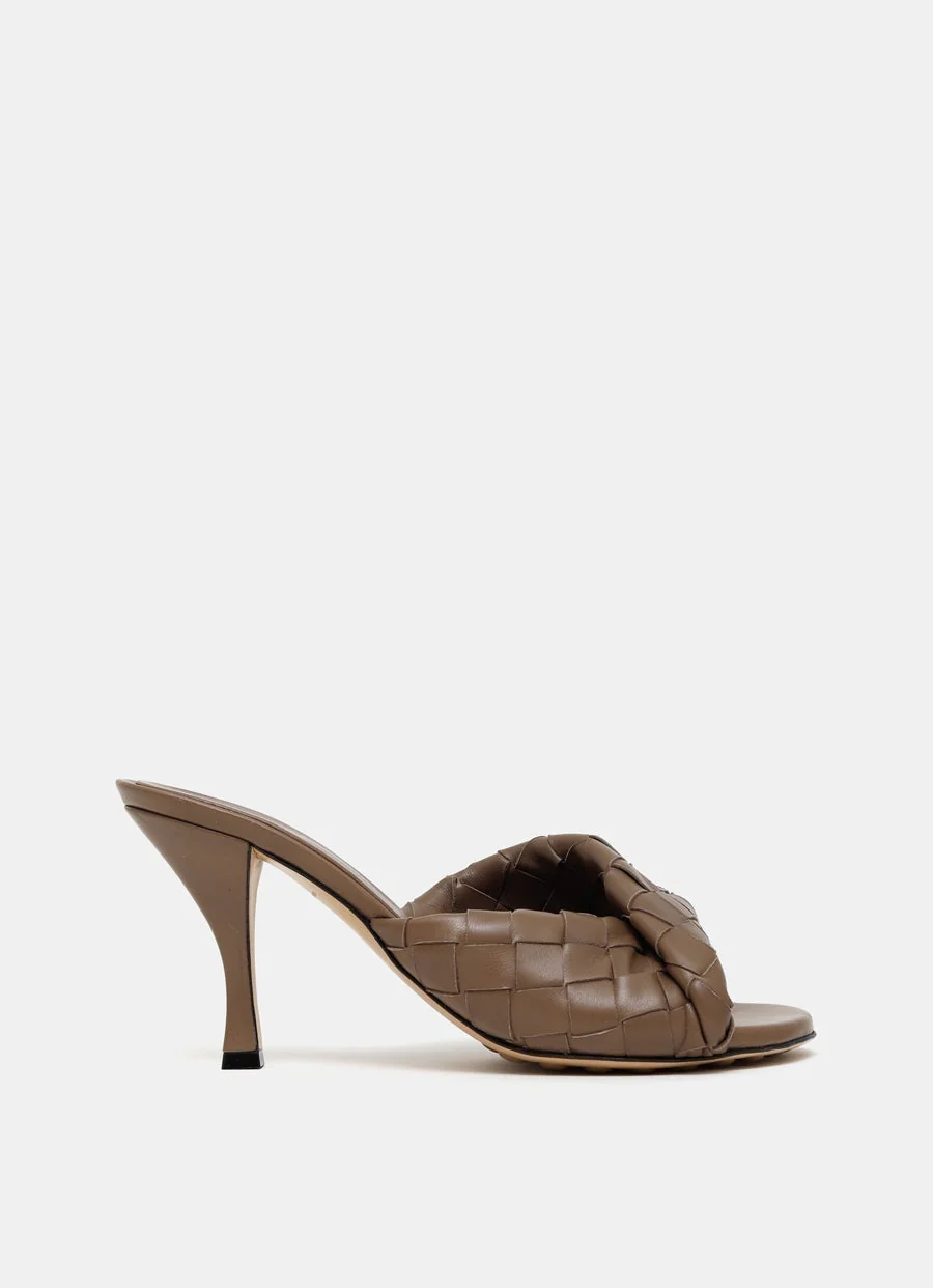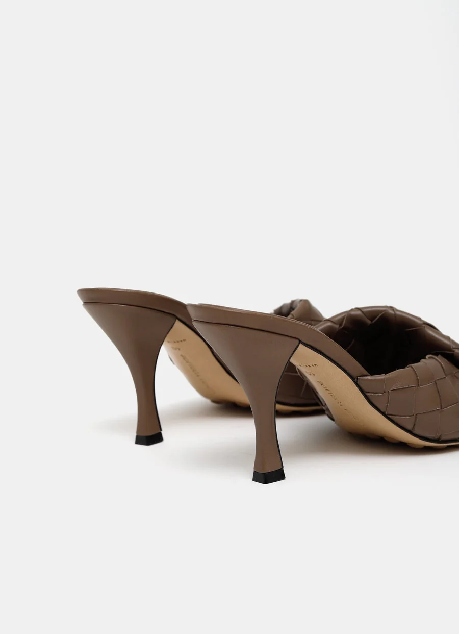 Mule de Bottega Veneta en piel con dise帽o Intrecciato, tira superior retorcida, plantilla con logo grabado y suela de piel con tacos de goma. Tac贸n de 8 cm. Hechas en Italia. Talla normal, escoge tu talla habitual. Tallaje italiano.