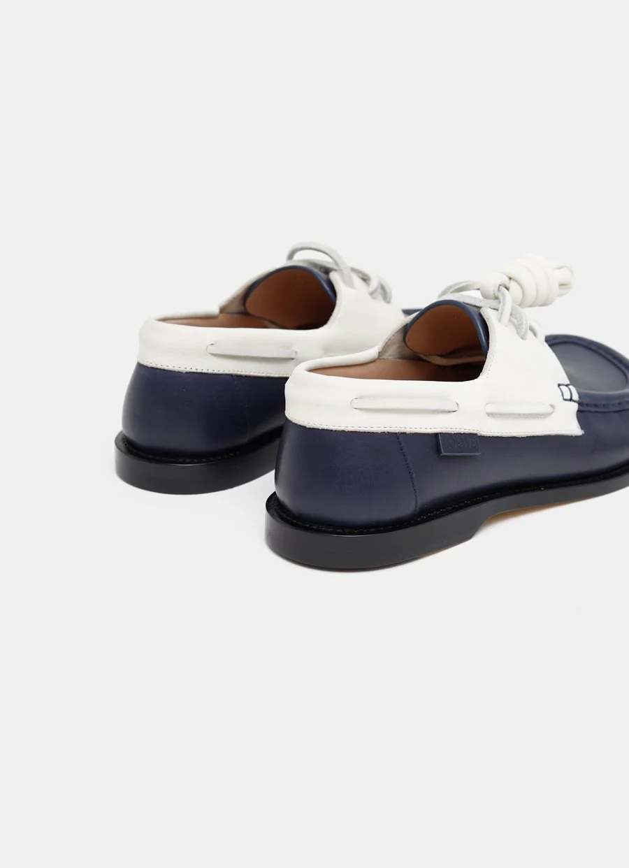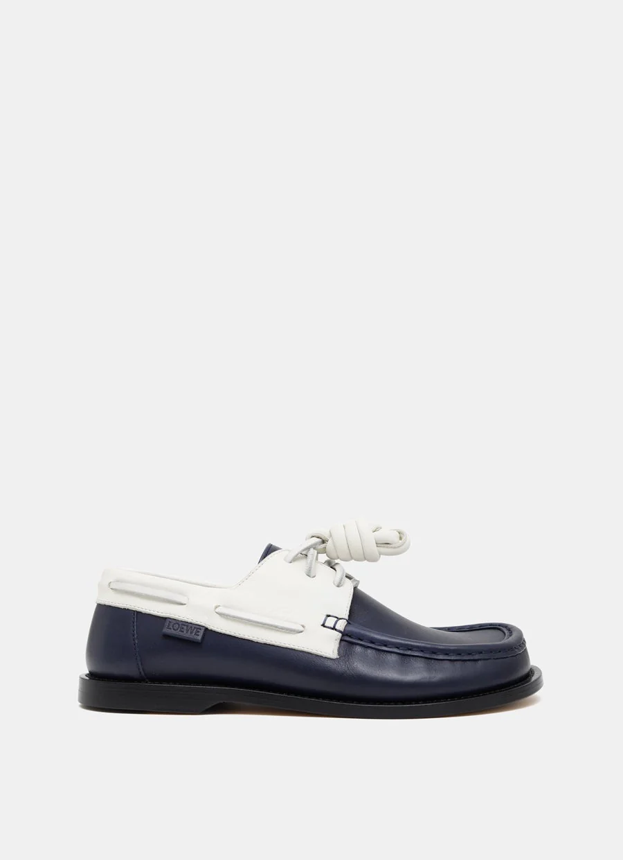 Náutico de Loewe en piel de becerro bicolor cosida a mano. Con puntera redonda, cierre de cordones de piel con nudo flamenco removible, plantilla de piel, suela de goma con tacón de 20 mm y etiqueta lateral con logo en relieve. Hecho en Italia. Talla normal, escoge tu talla habitual. Tallaje UE para mujer.