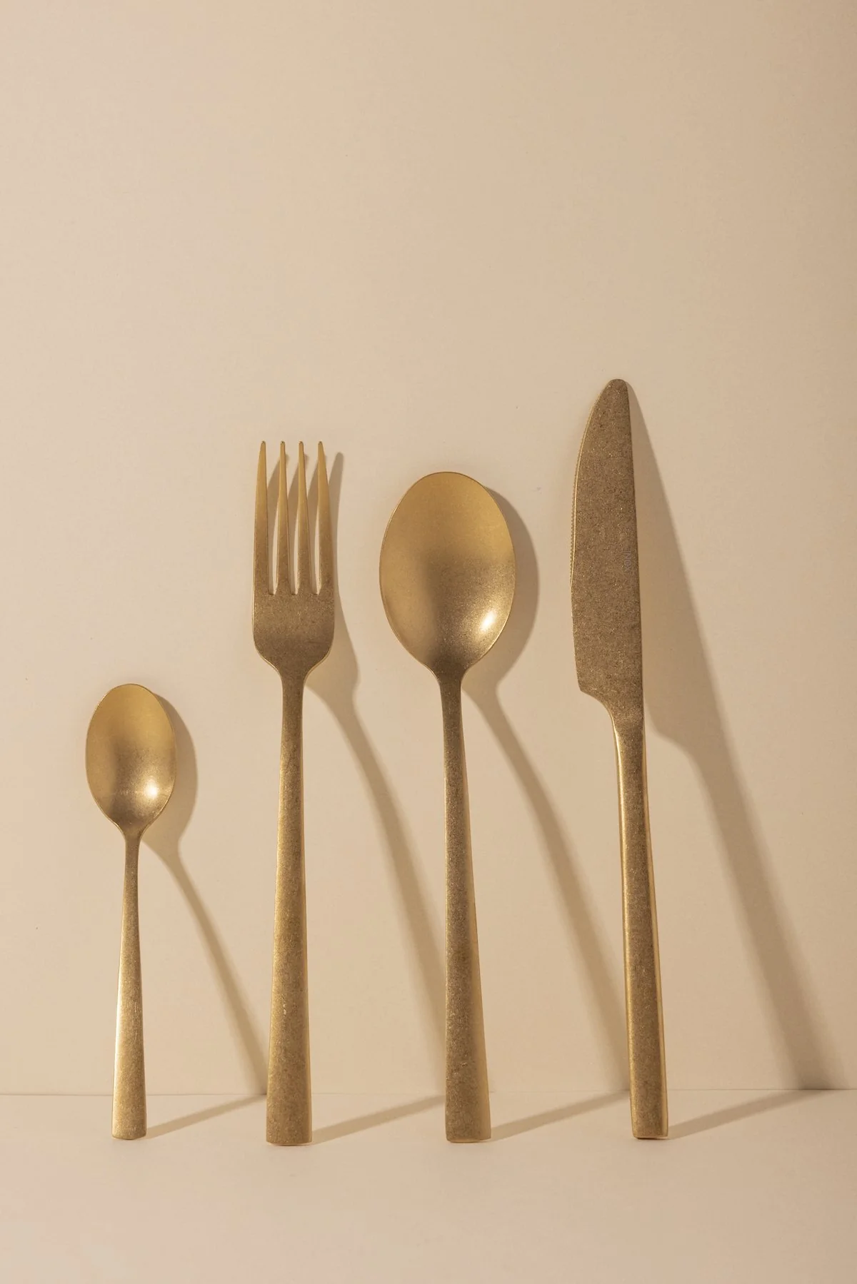 Cuchara, tenedor, cuchillo y cuchara de postre en acero inoxidable color dorado de efecto vintage.