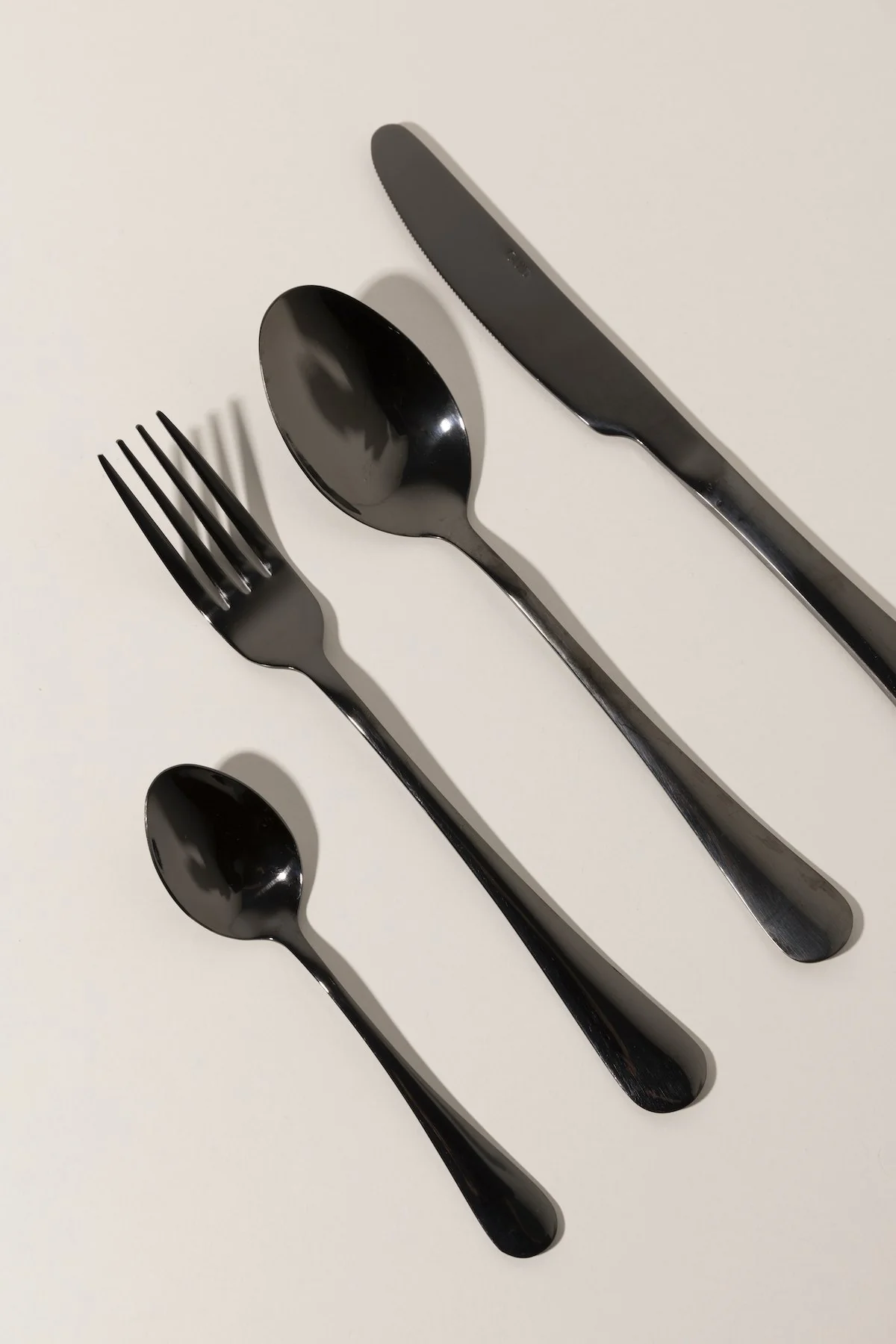 Cuchara, tenedor, cuchillo y cuchara de postre en acero inoxidable color negro.