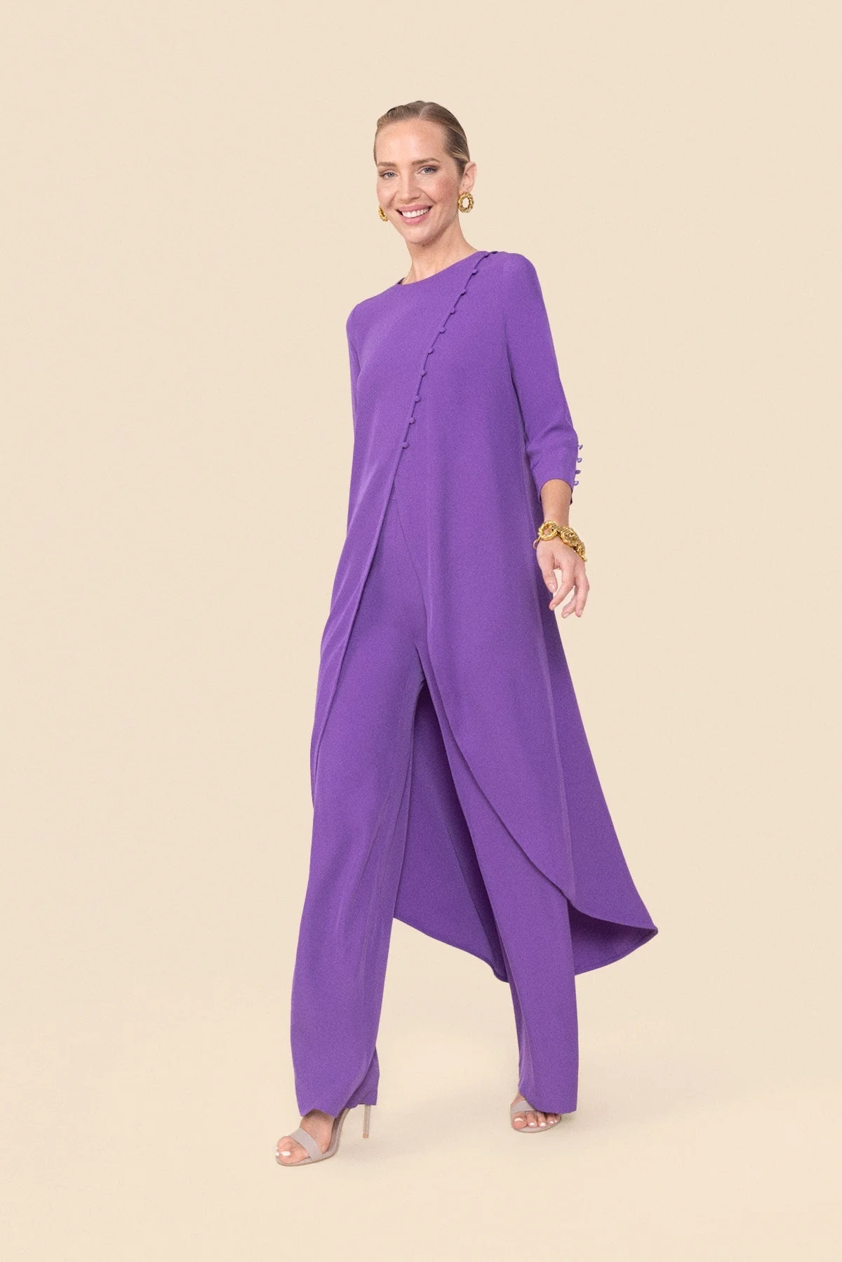 Volvemos con una versi贸n inspirada en uno de nuestros looks m谩s famosos: Maca y Doris. Esta vez nos vamos al cierre delantero lateral con botones forrados en el mismo tejido para un resultado impecable de sastrer铆a y un bajo asim茅trico.