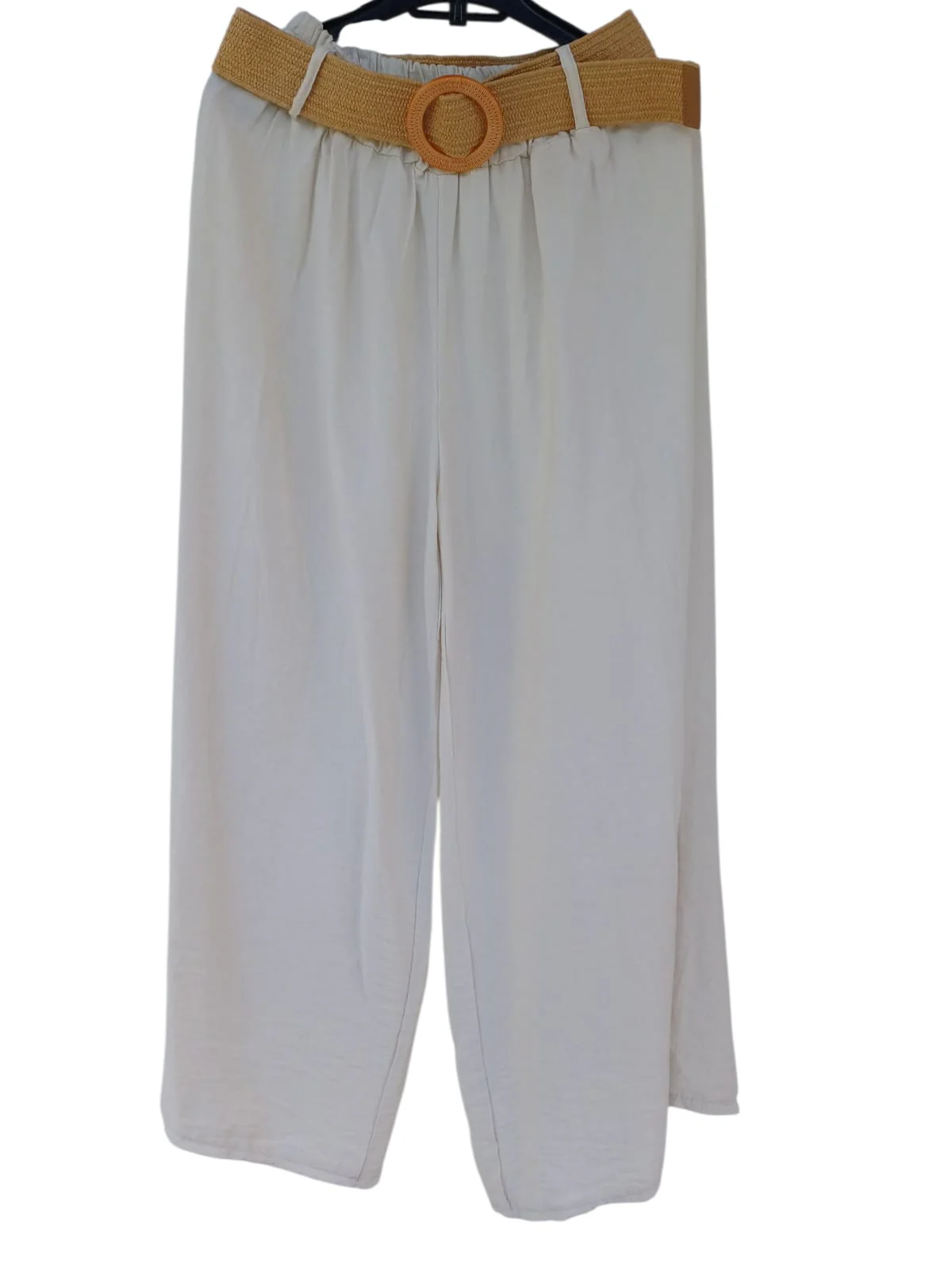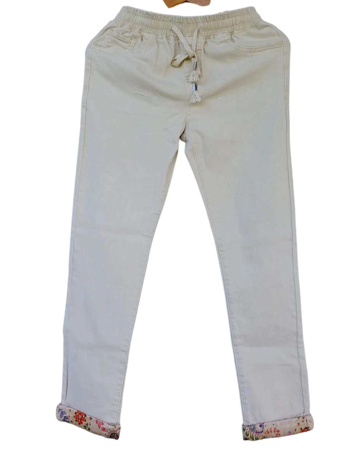 Pantal贸n 100% lino, color blanco con estampado turqueza.