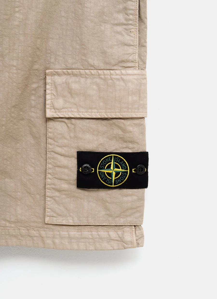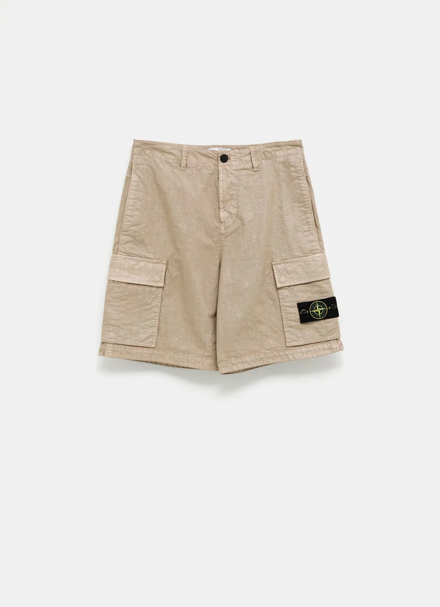 Pantal贸n corto de Stone Island en tejido de nailon con textura org谩nica. Con cinco bolsillos, cierre de bot贸n y cremallera, detalle de parche con logo. Corte ancho y holgado. Talla normal, escoge tu talla habitual. Tallaje jeans para hombre.