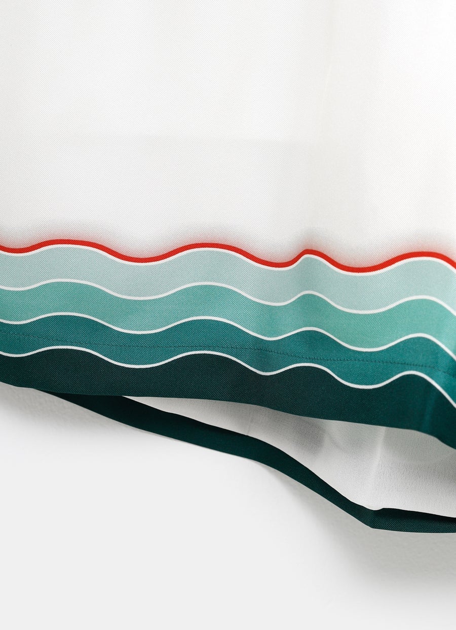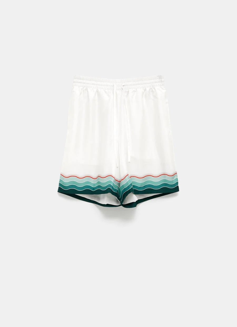 Shorts de Casablanca en sarga de seda con estampado de inspiración japonesa, cintura elástica con cordón, tres bolsillos y largo por encima de la rodilla. Hechos en Italia. Corte relajado. Talla normal, elige tu talla habitual. Tallaje estándar para hombre.