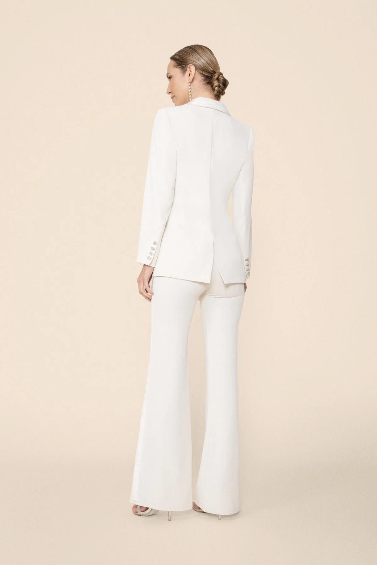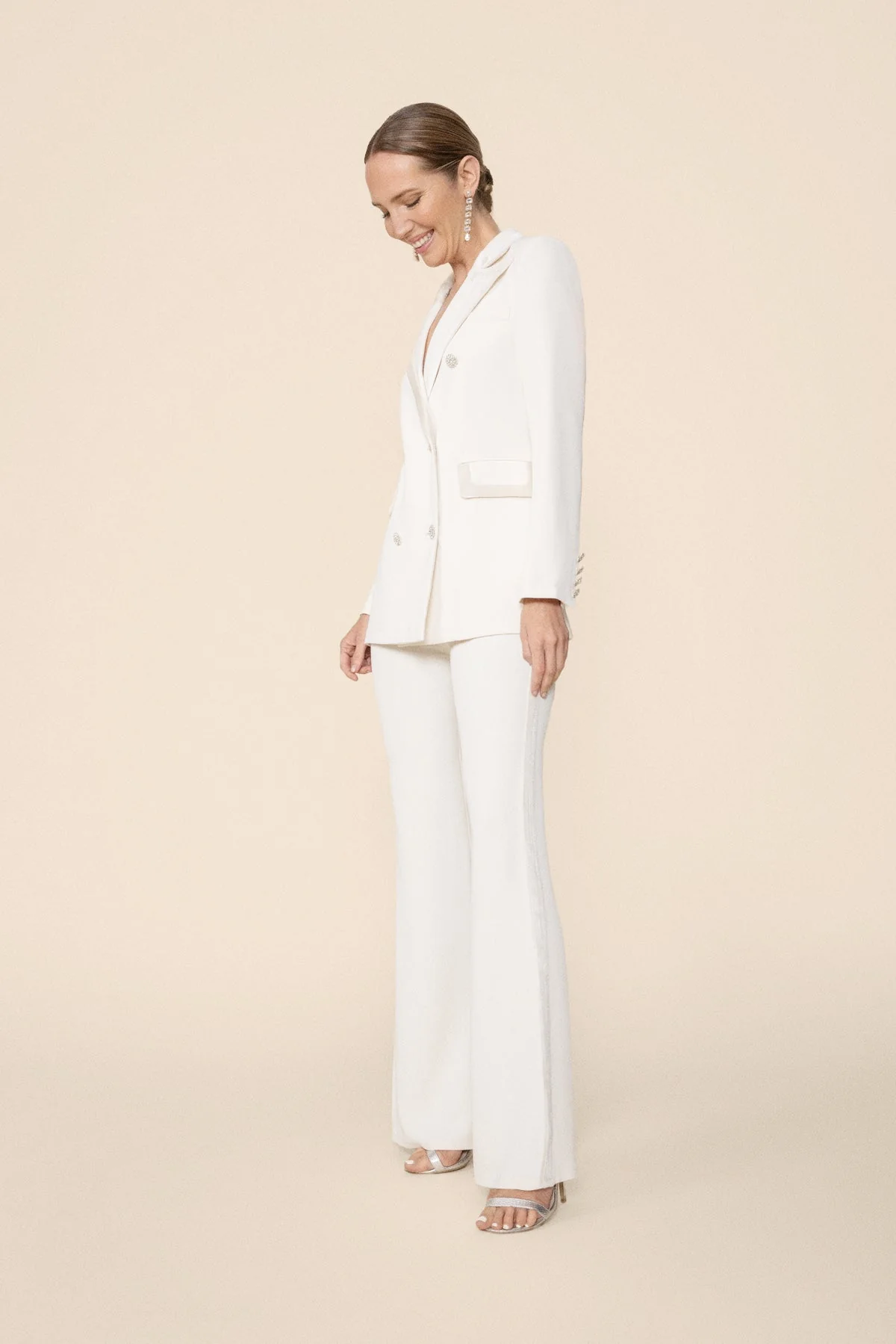 Pantal贸n para novia con vivos de terciopelo coordinados estilo smoking, silueta de corte en cintura.