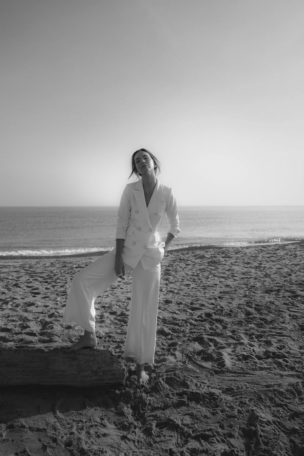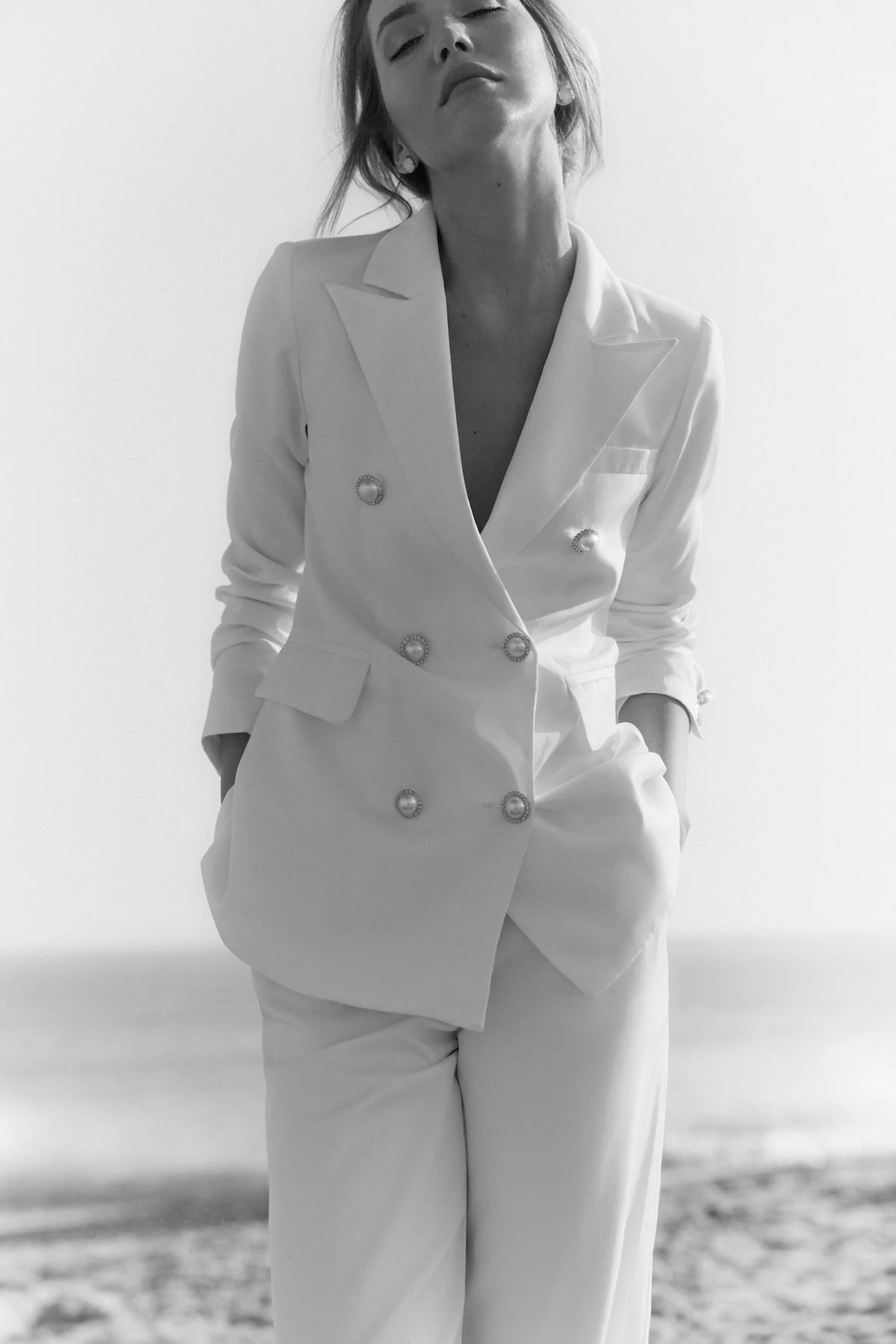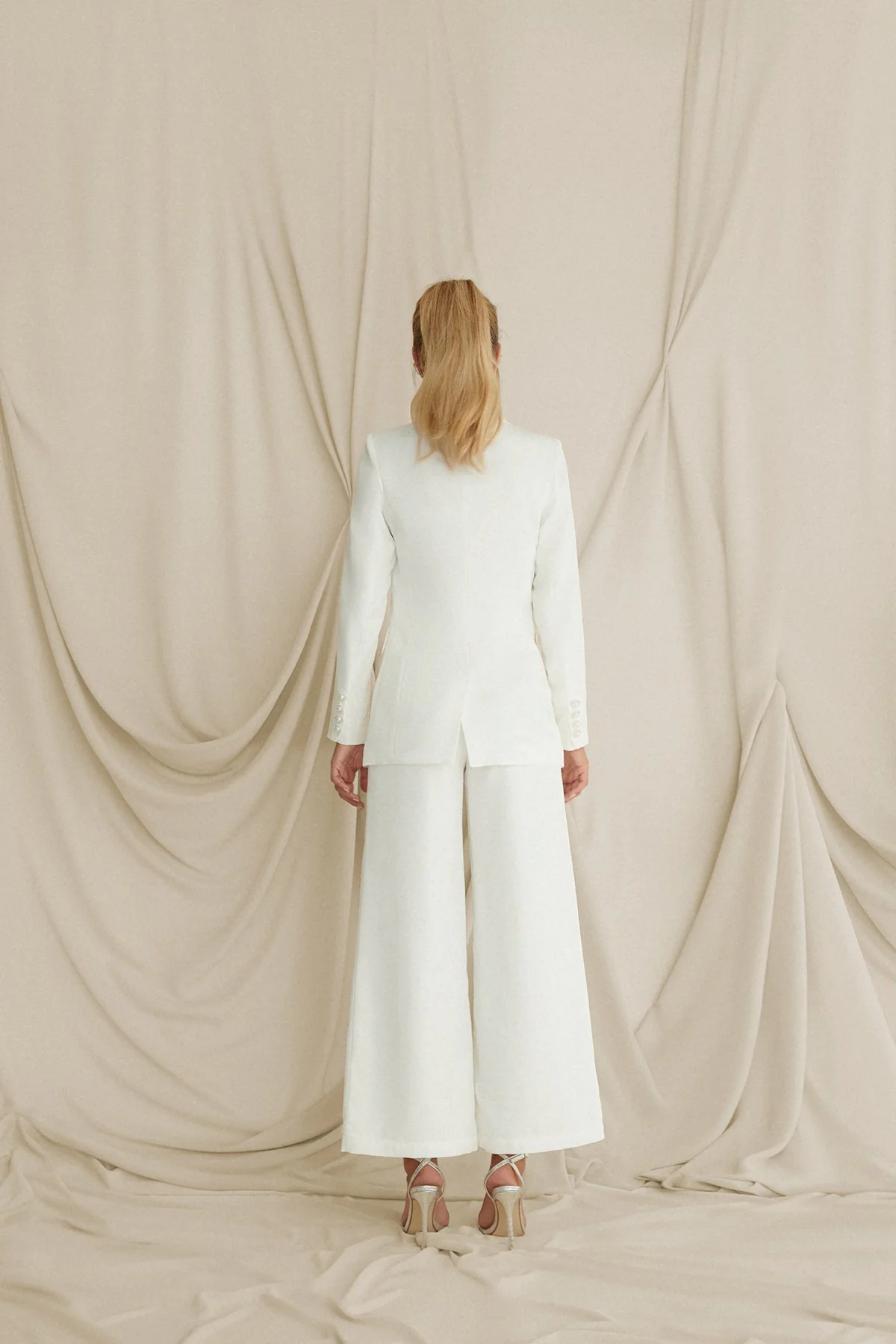 Dise帽o de pantal贸n de novia muy chic tipo culotte con tablas en el delantero.