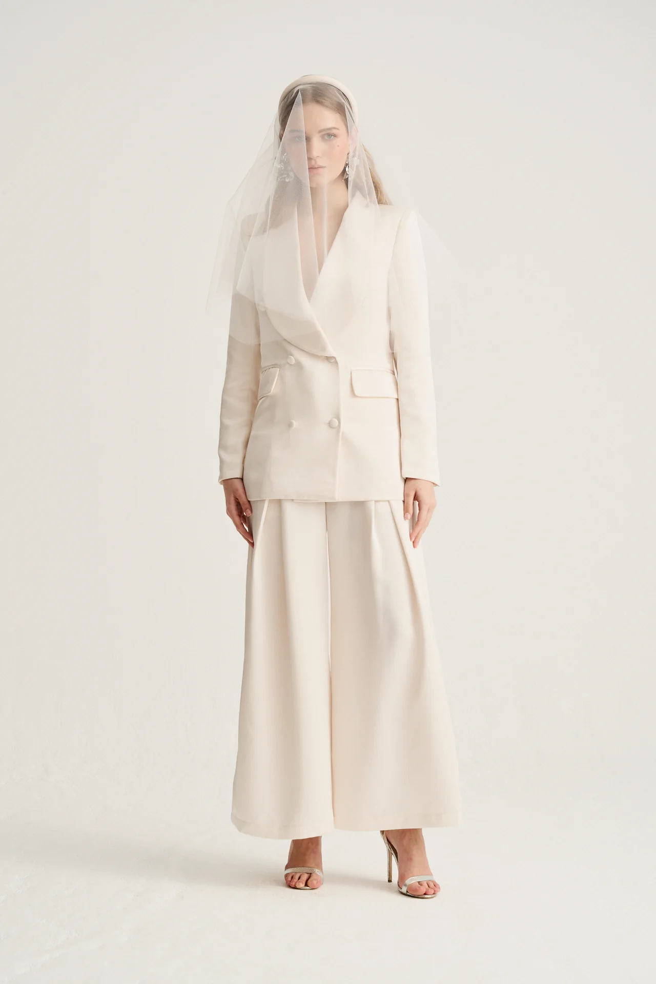 Este pantal贸n en beige vintage, dise帽ado para combinar perfectamente con la chaqueta Nooma, es la definici贸n de sofisticaci贸n y estilo atemporal. Confeccionado en tejido tipo mikado, ofrece una estructura impecable y un acabado refinado, ideal para novias que buscan un look elegante y diferente.