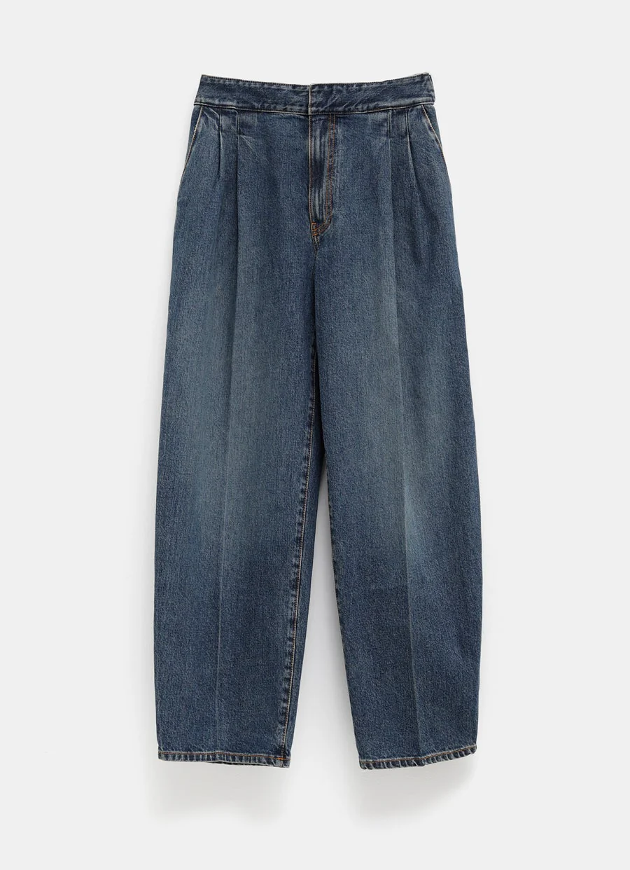 Pantal贸n de franela Ala茂a en tejido denim lavado, con talle bajo, cintura ajustable con botones y corte c贸nico. Hechos en Italia. Tallaje normal, elige tu talla habitual. Tallaje UE.