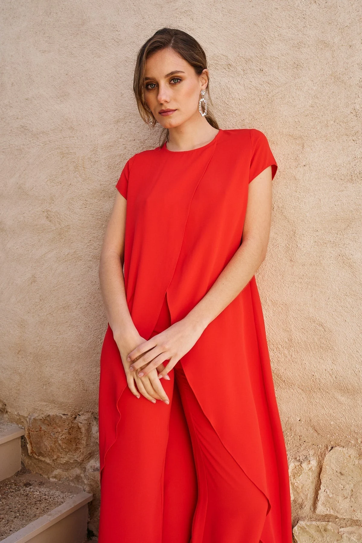 Ideal conjunto compuesto de top largo asim茅tico y pantalon a juego. Top con manga corta, cuello a la caja y cierre de boton en espalda. Dise帽o de capas cruzadas en delantero.
