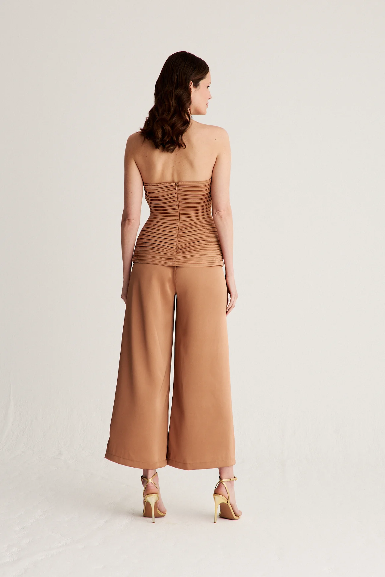 Confeccionado en un tono caramelo o caf茅 con leche muy elegante, combina estructura y fluidez en una prenda que destaca por su ca铆da impecable. El cierre de cremallera invisible en la parte trasera asegura un acabado limpio y favorecedor.