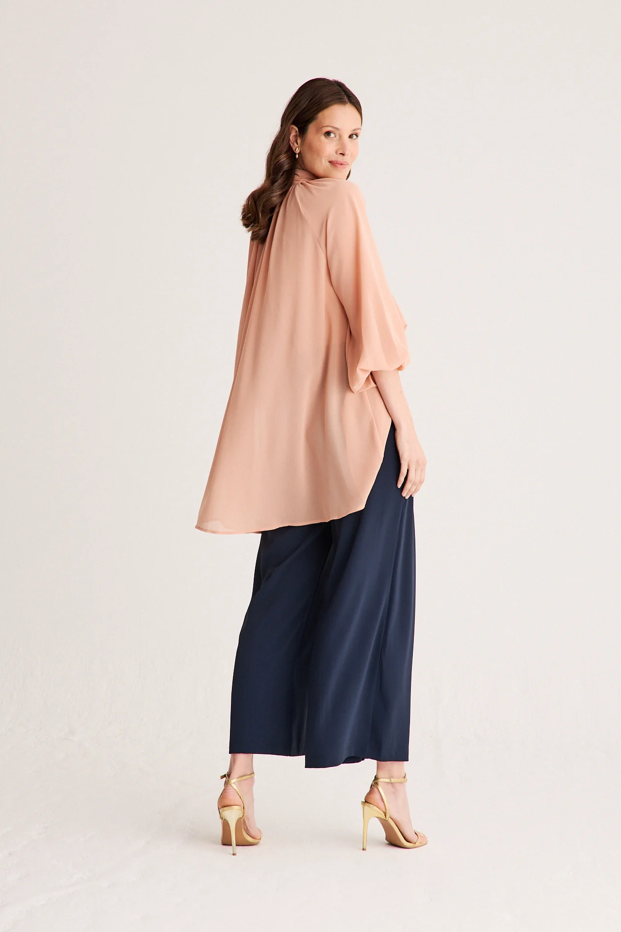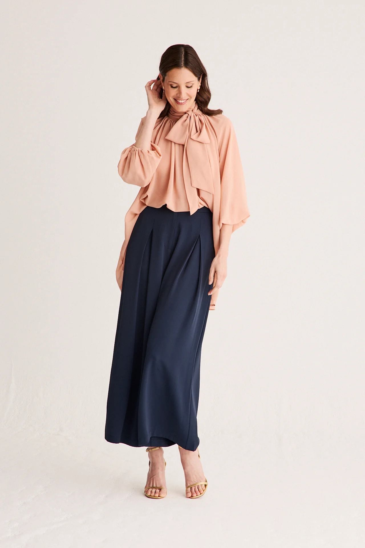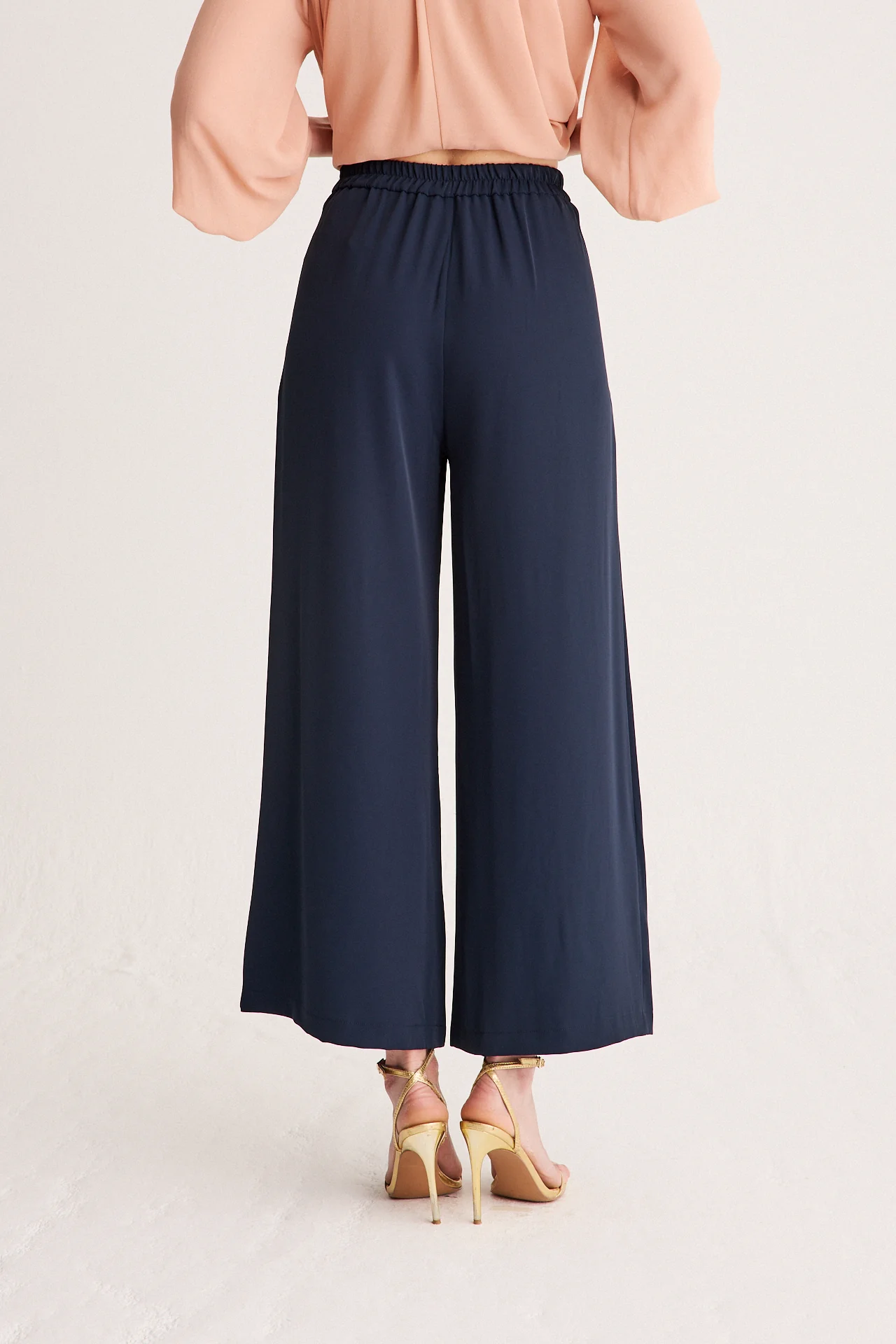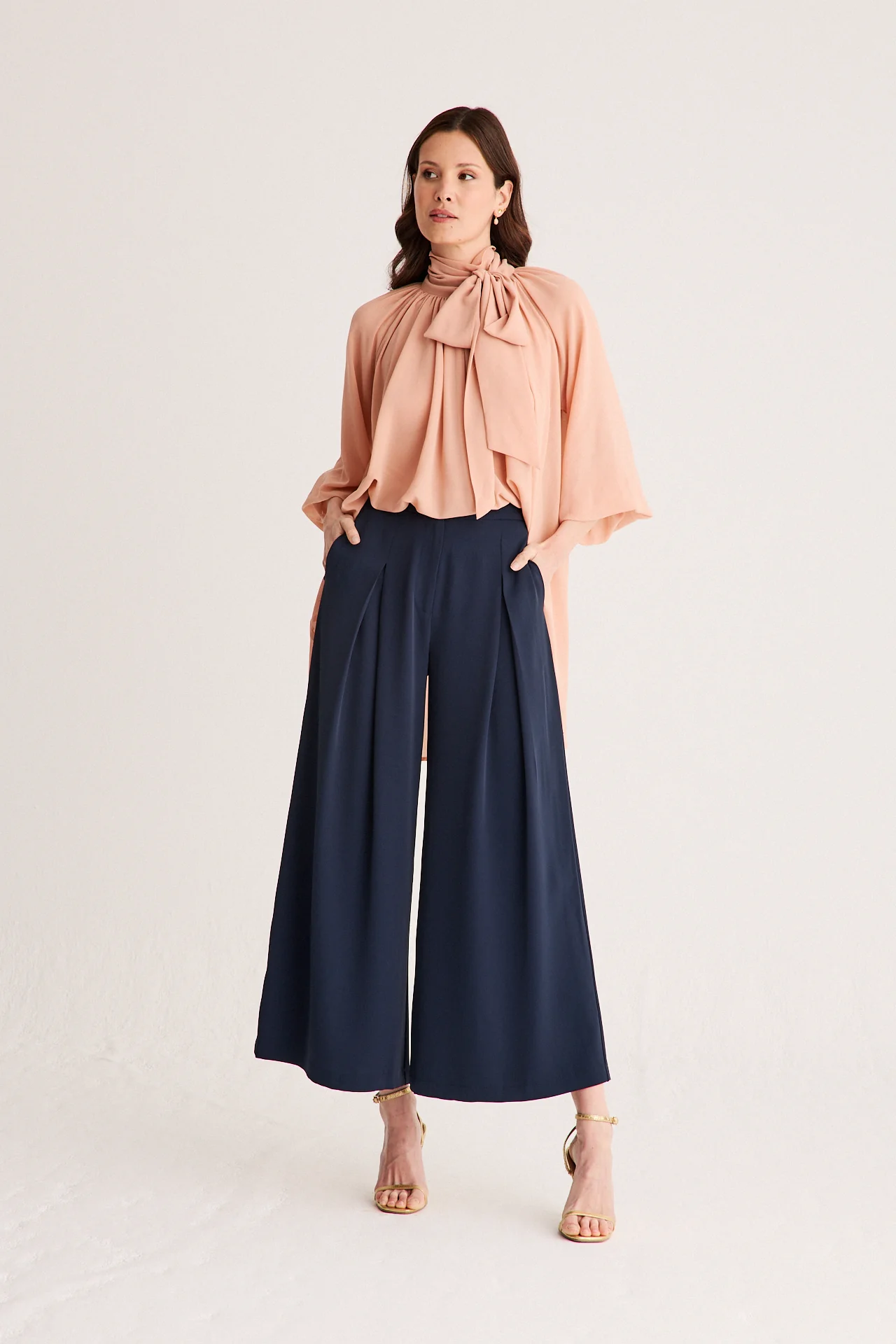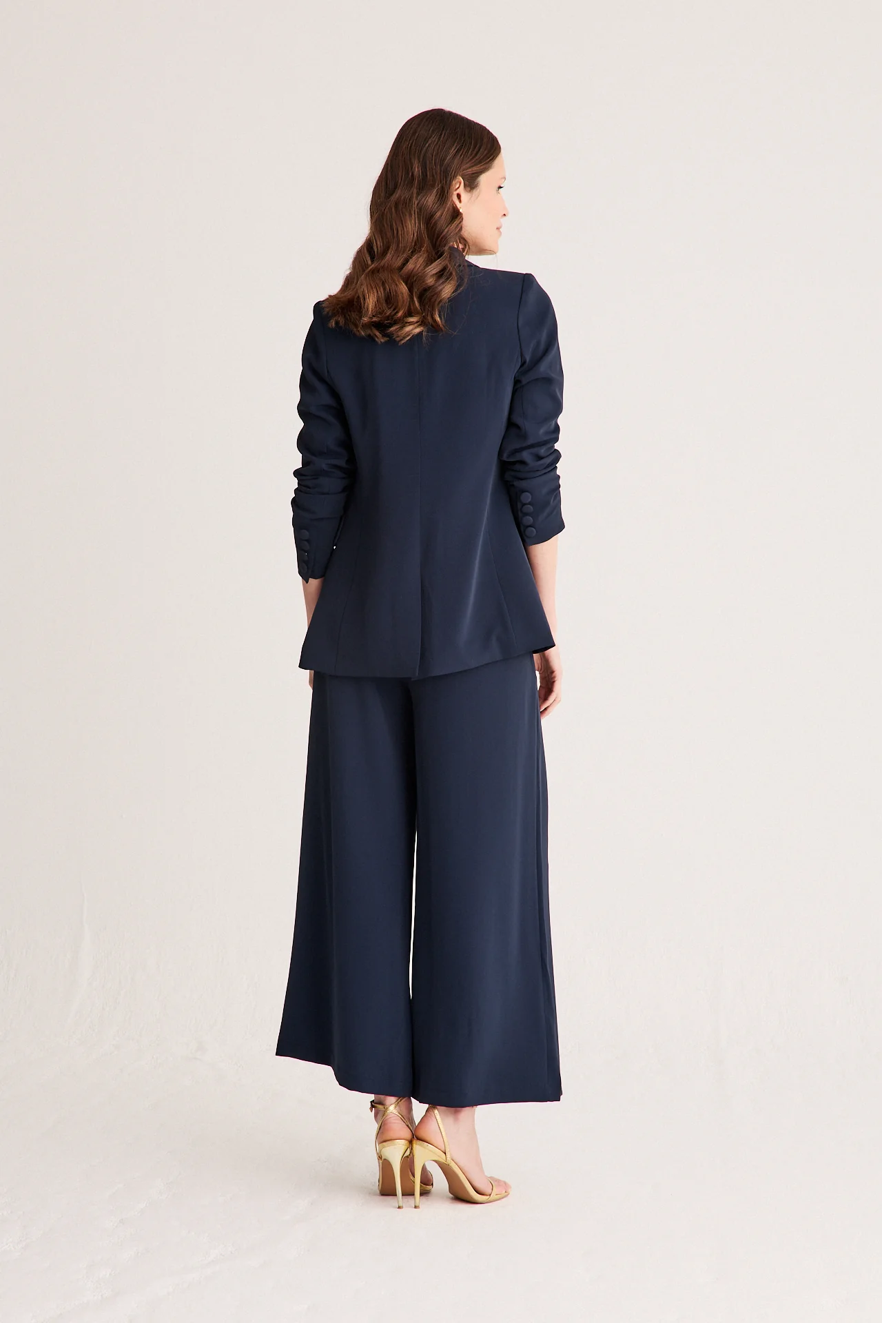El pantal贸n atemporal que equilibra elegancia y comodidad en cada paso. Dise帽ado para completar el conjunto con la chaqueta de solapas curvas a juego, este pantal贸n tipo culotte aporta ligereza, frescura y un aire sofisticado que trasciende tendencias.