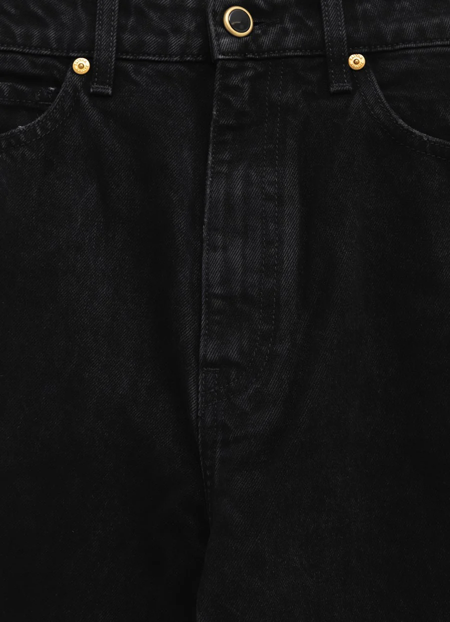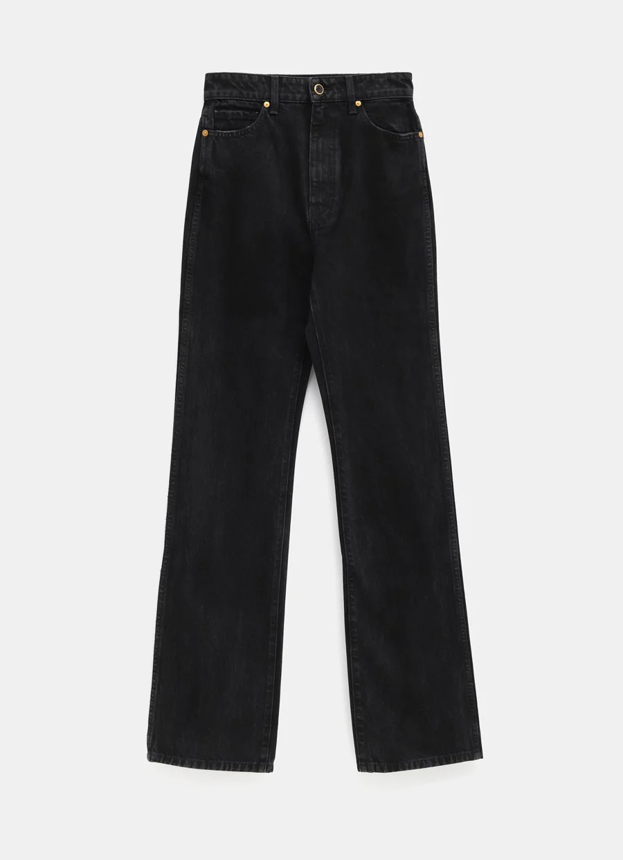 Pantalón vaquero de Khaite de tiro alto con botón esmaltado y cierre de cremallera. Corte de tubo y acabado artesanal. Talla normal, elige tu talla habitual. Tallaje de vaqueros para mujer.