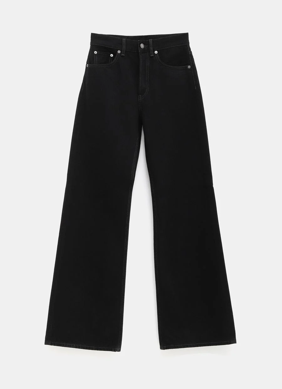 Pantalón de Acne Studios en denim rígido con talle medio, pierna ancha y recta, cinco bolsillos y cierre con cremallera. Corte regular. Talla normal, escoge tu talla habitual. Tallaje jeans para mujer.