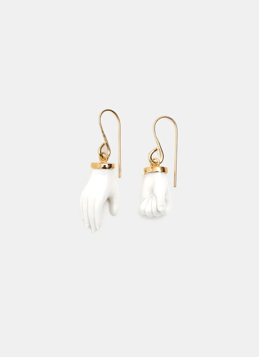 Par de pendientes de Andrés Gallardo fabricados en latón chapado en oro de 18k con colgantes de porcelana en forma manos. Realizados por artesanos españoles en el estudio de la marca en Madrid. Para orejas perforadas. Cierre de hancho. Tamaño: 3 x 2 cm aprox.