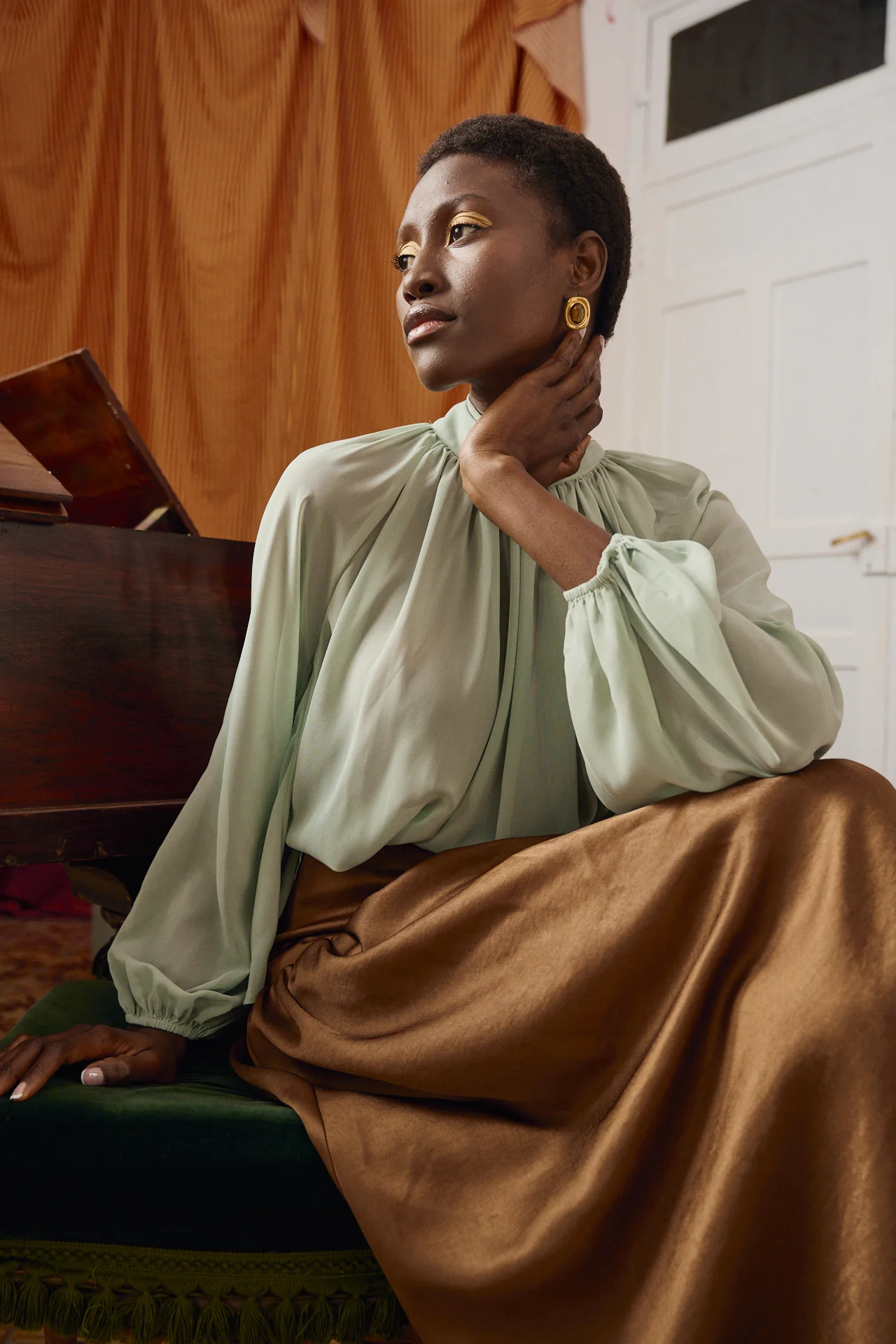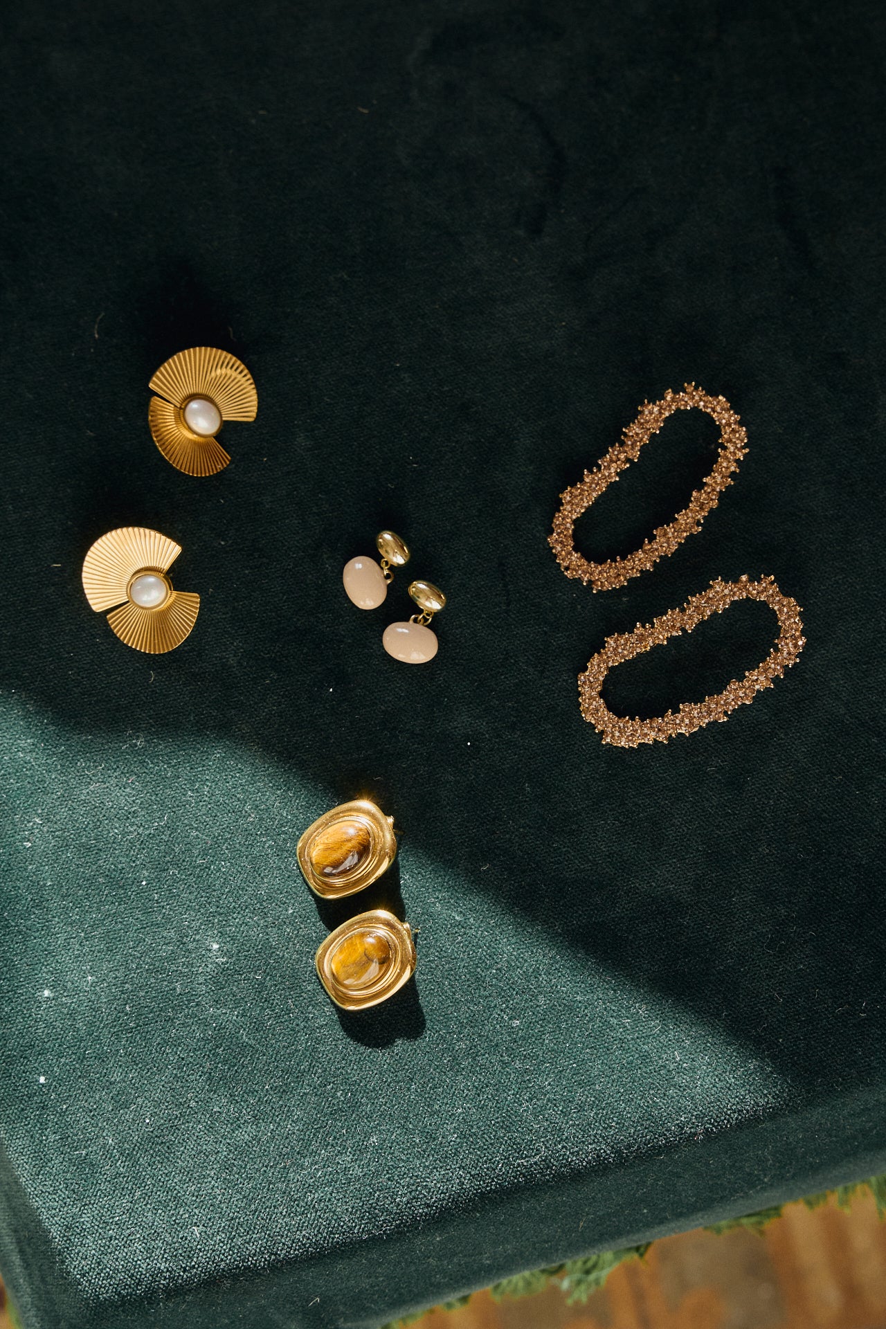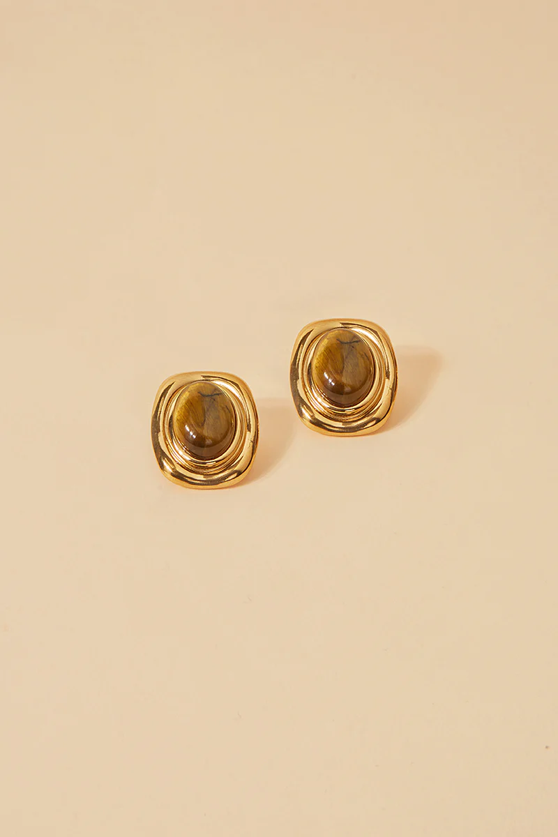 Pendientes cuadrados dorados con detalle de pieza central en tonos marrones.