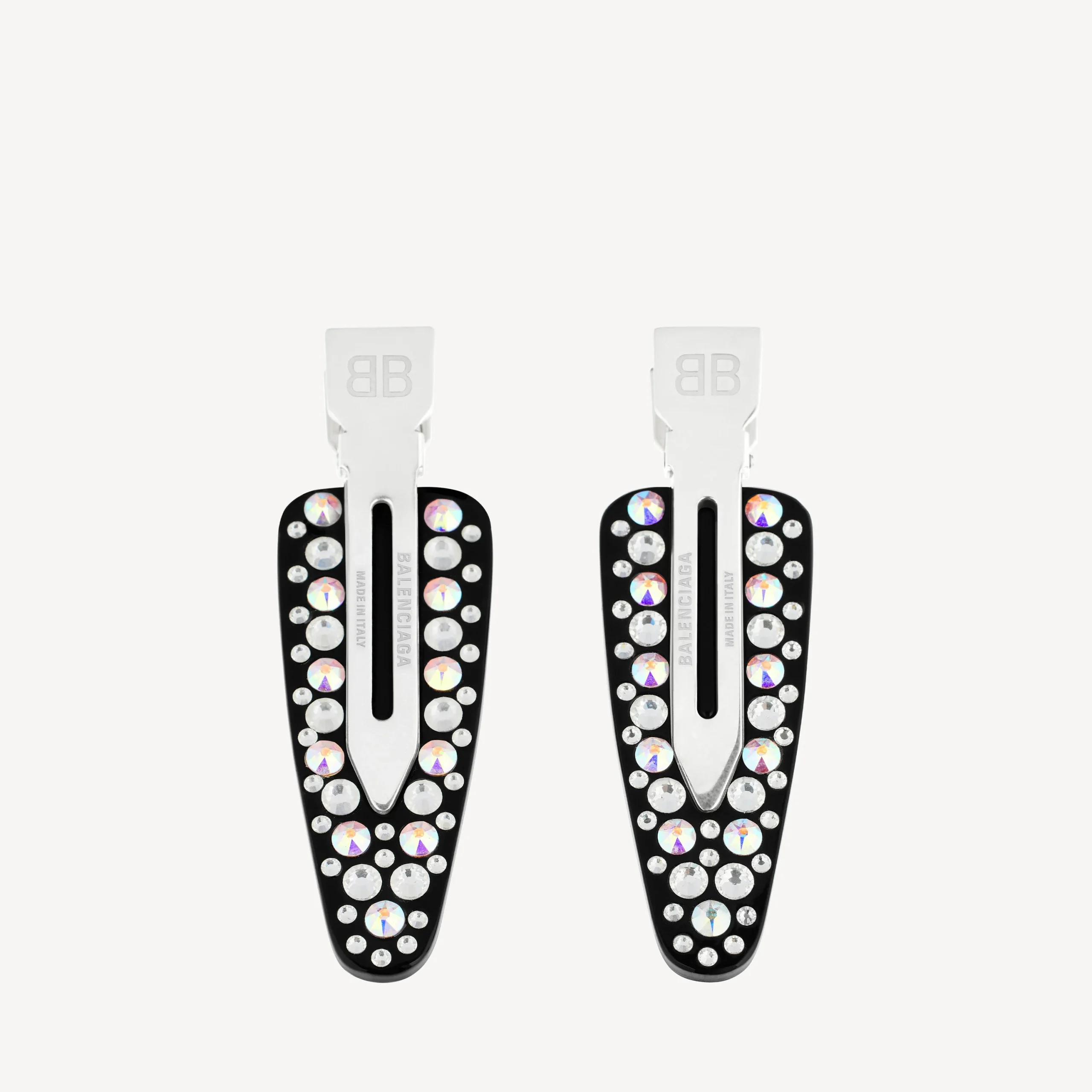 Par de pinzas para el pelo de Balenciaga en latón y acetato con detalle de cristales iridiscentes y logo BB grabado. Hechas en Italia. Este artículo no contiene níquel ni plomo, y es hipoalergénico. Tamaño: 7.8 x 2.5 cm aprox.
