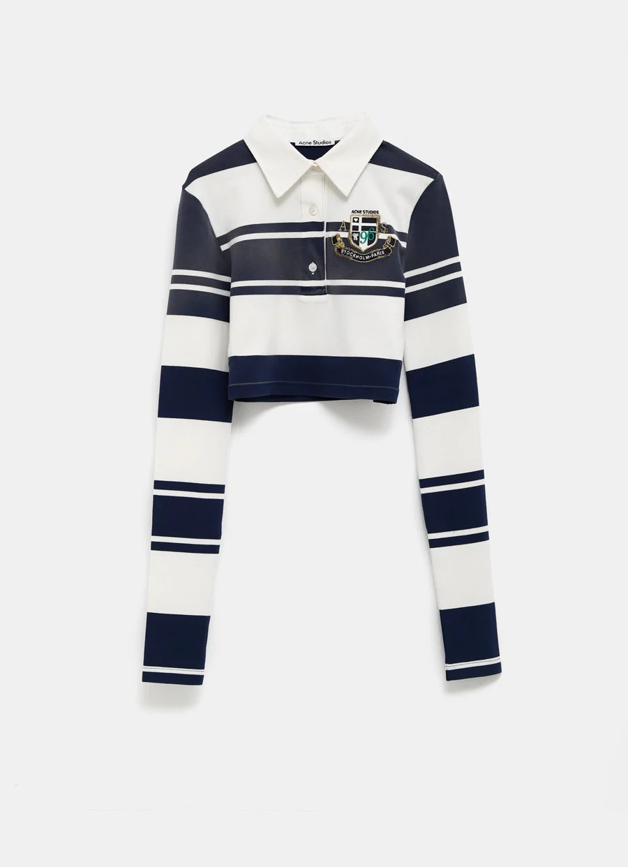 Polo de Acne Studios con manga larga, escudo con logo y estampado a rayas con efecto descolorido. Corte ajustado y largo cropped. Hecho en Portugal. Talla normal, elige tu talla habitual. Tallaje estándar para mujer.