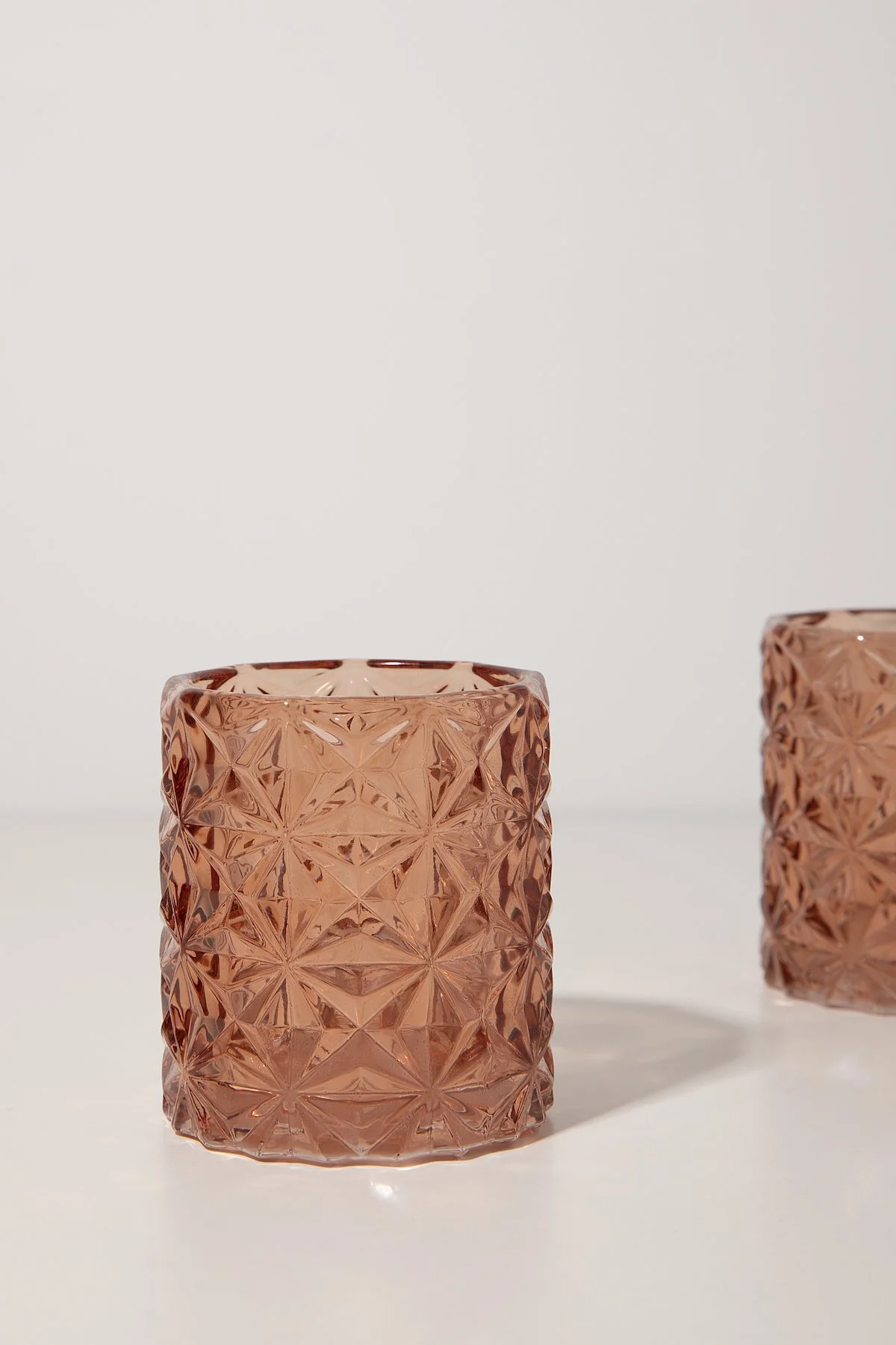 Portavelas en vidrio tallado en forma de diamante en color rosé.