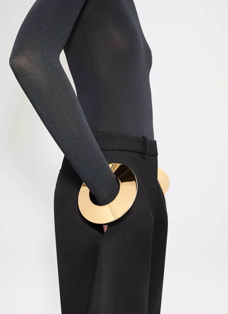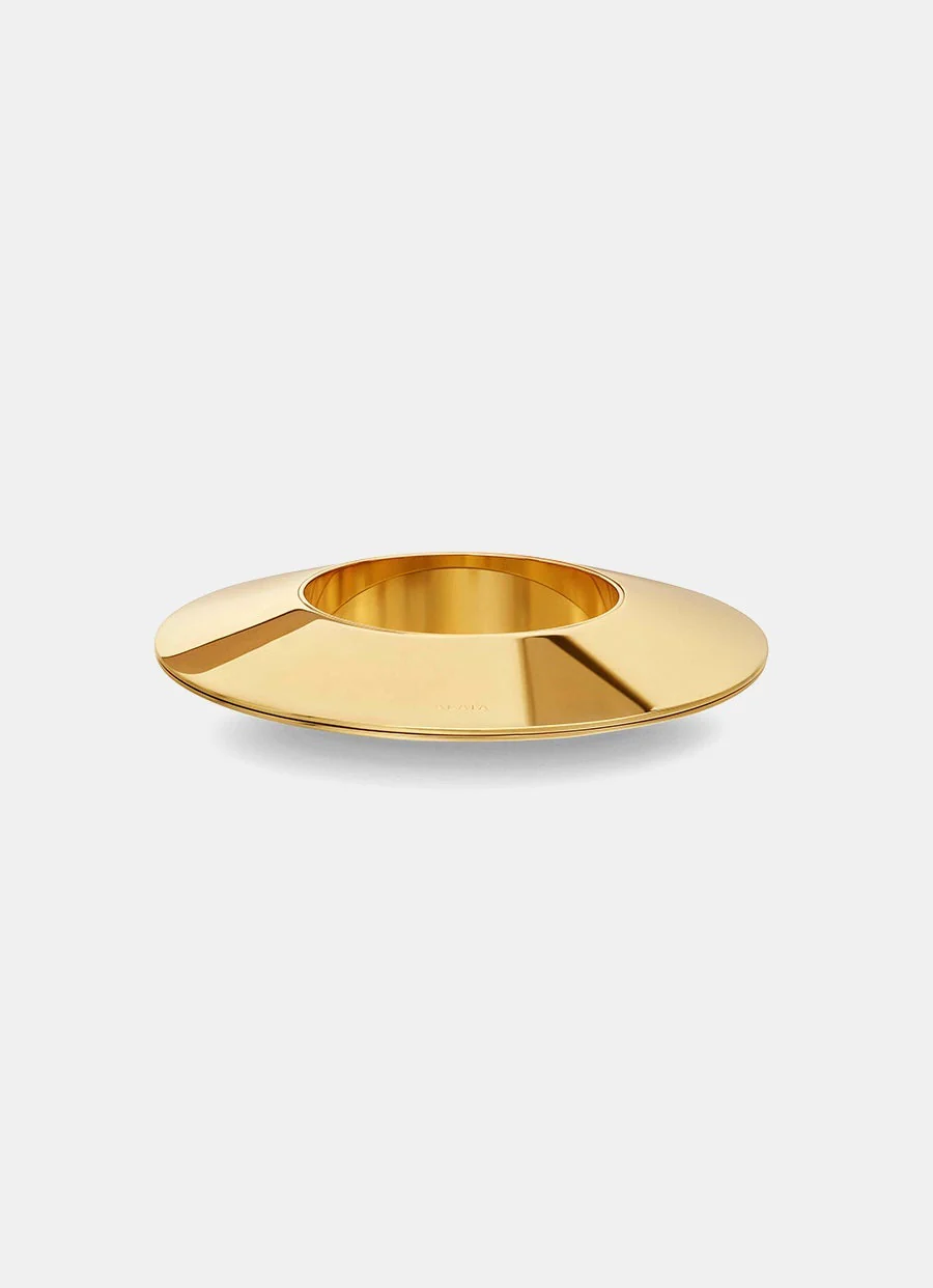 Pulsera dorada con forma de disco de Alaïa. Diámetro exterior: 125 mm. Diámetro interior: 64 mm. Hecha en Italia.