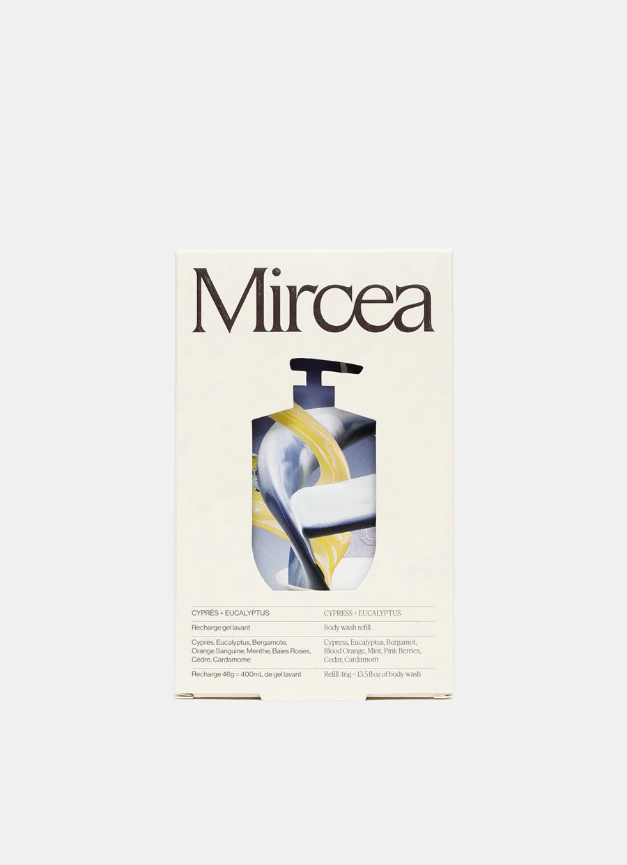 Recambio de gel de ducha de Mircea que incluye un sobre soluble de 46 gramos. Fórmula de aceites esenciales y se disuelve en agua. Perfume 100% natural, fórmula vegana sin ingredientes sintéticos agresivos ni sulfatos. Espuma densa y envolvente que deja la piel extra suave. Modo de empleo: llenar la botella con agua hasta el logotipo, verter los gránulos, cerrar y agitar. Hecho en Grasse, Francia. Incluye: recambio de 46 g.