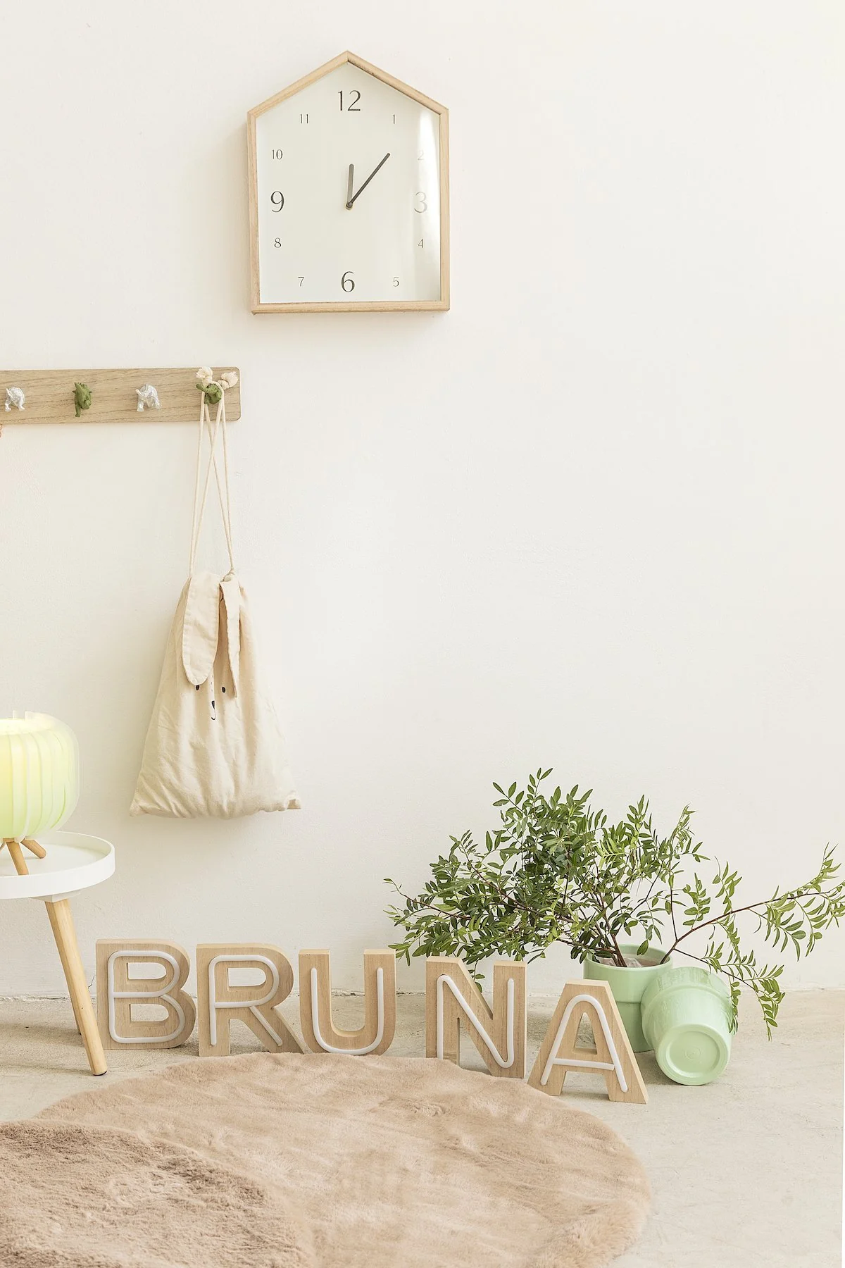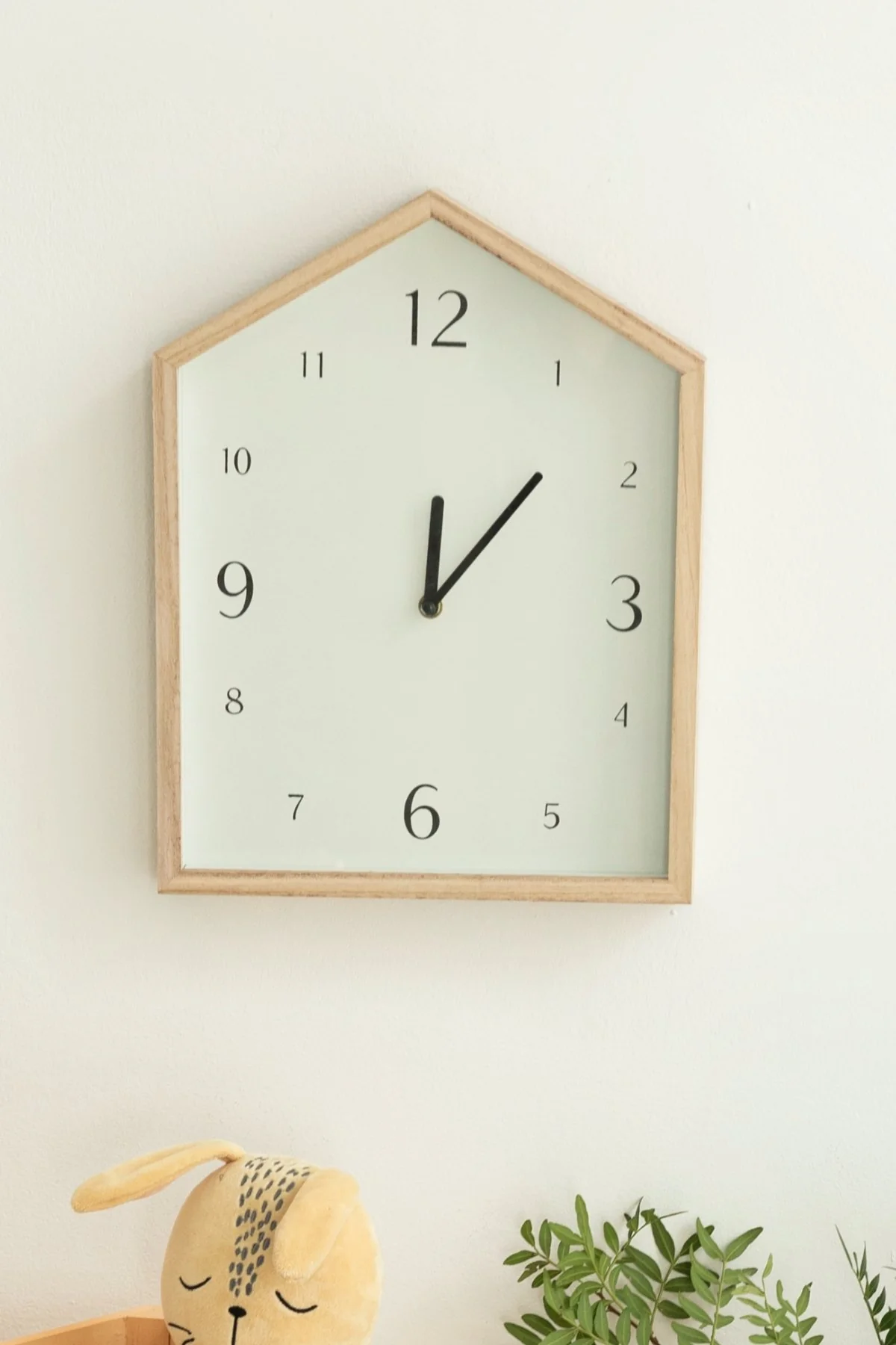 Reloj de pared en forma de casita con fondo en color marfil.