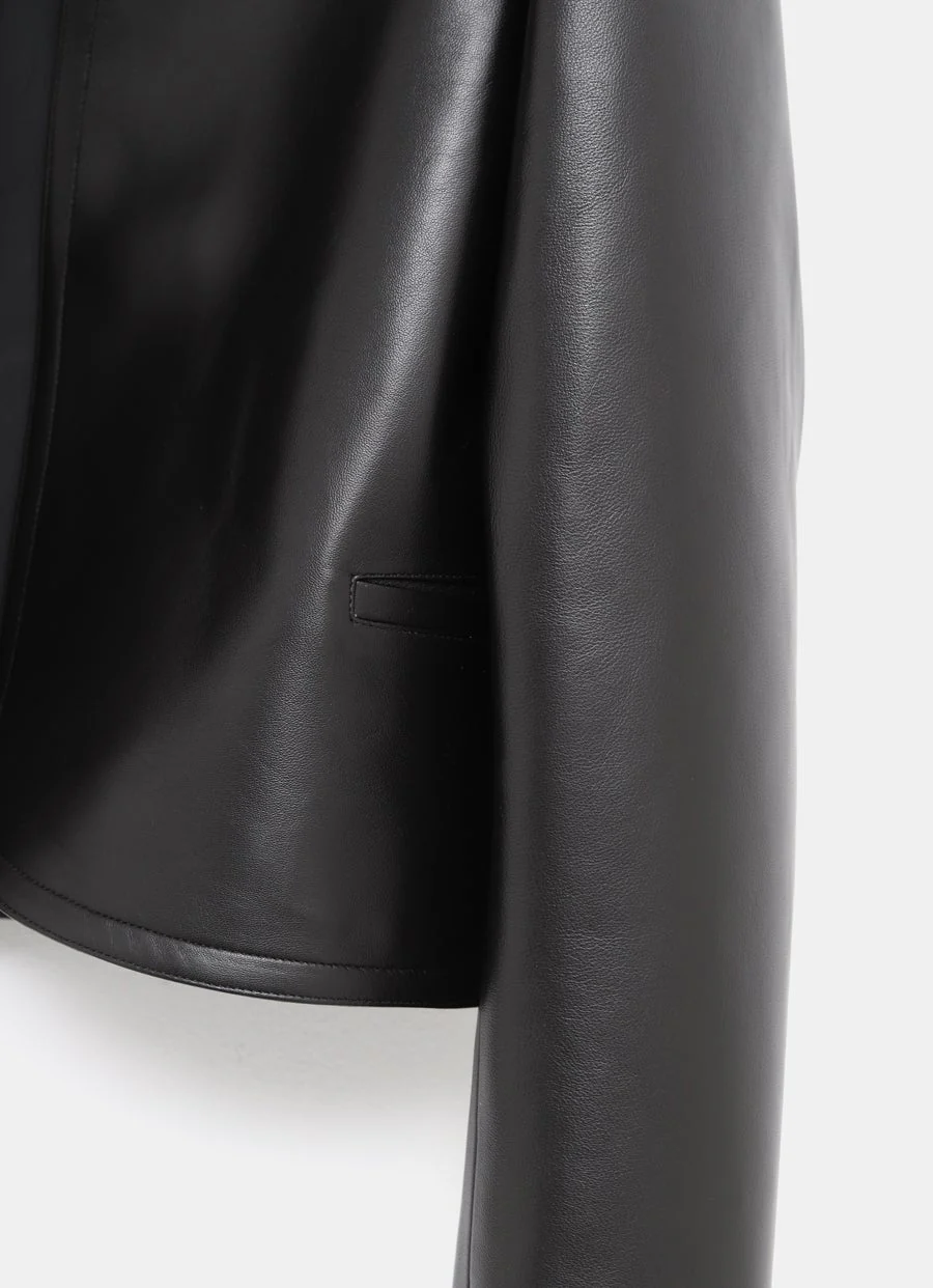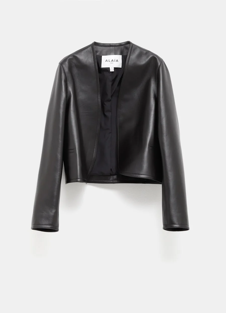 Chaqueta de Alaïa en piel de cordero con frontal abierto sin botones, sin solapas, manga larga, largo cropped y bajo redondeado. Corte ajustado. Hecha en Italia. Talla normal, elige tu talla habitual. Tallaje francés.