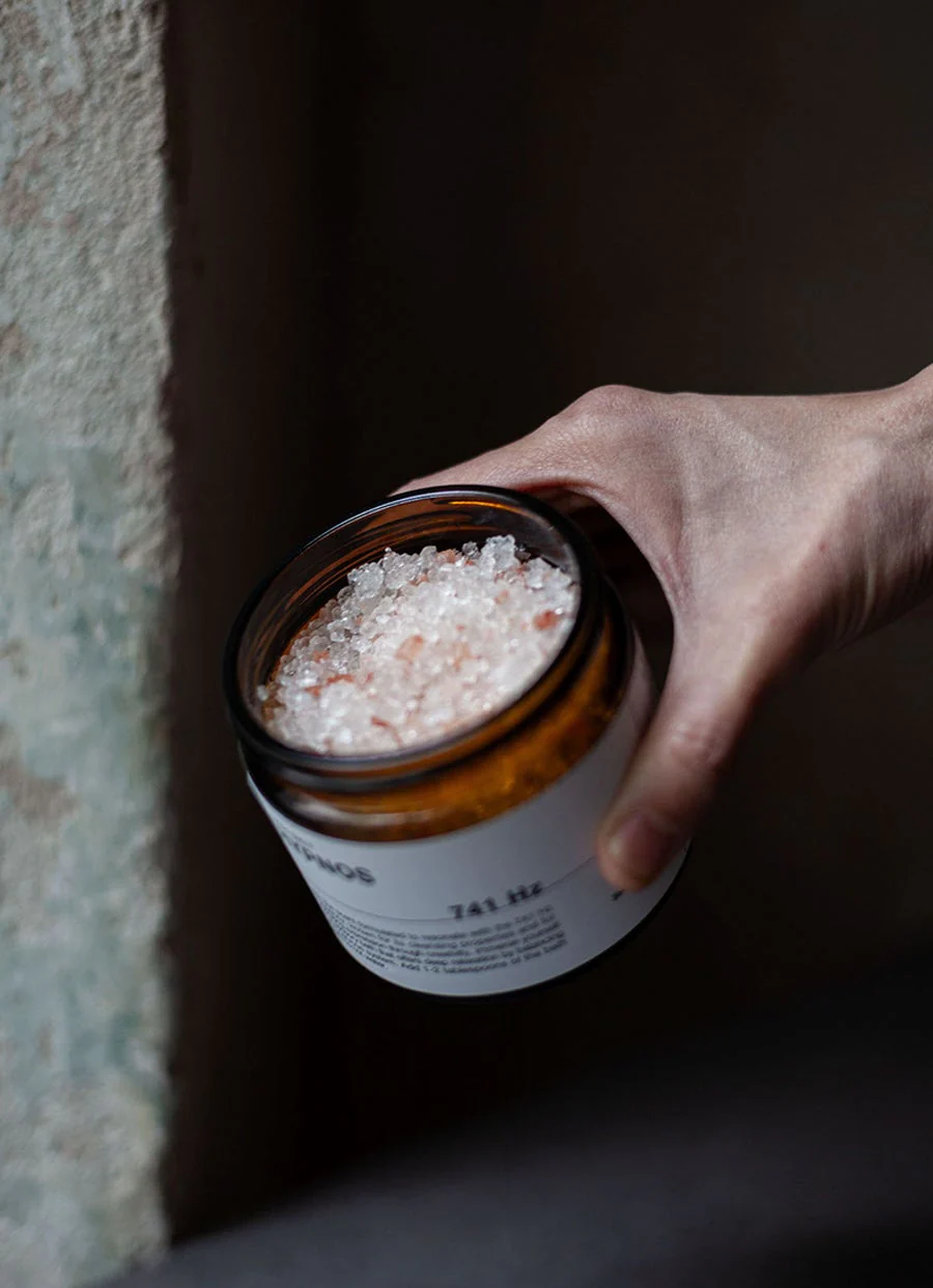 Sales de baño Ryoko que resuenan con la frecuencia de 741 hercios. Poseen propiedades purificadoras y ofrecen una profunda relajación al equilibrar el sistema nervioso. Hechas en Alemania. Tarro de 270 gramos.