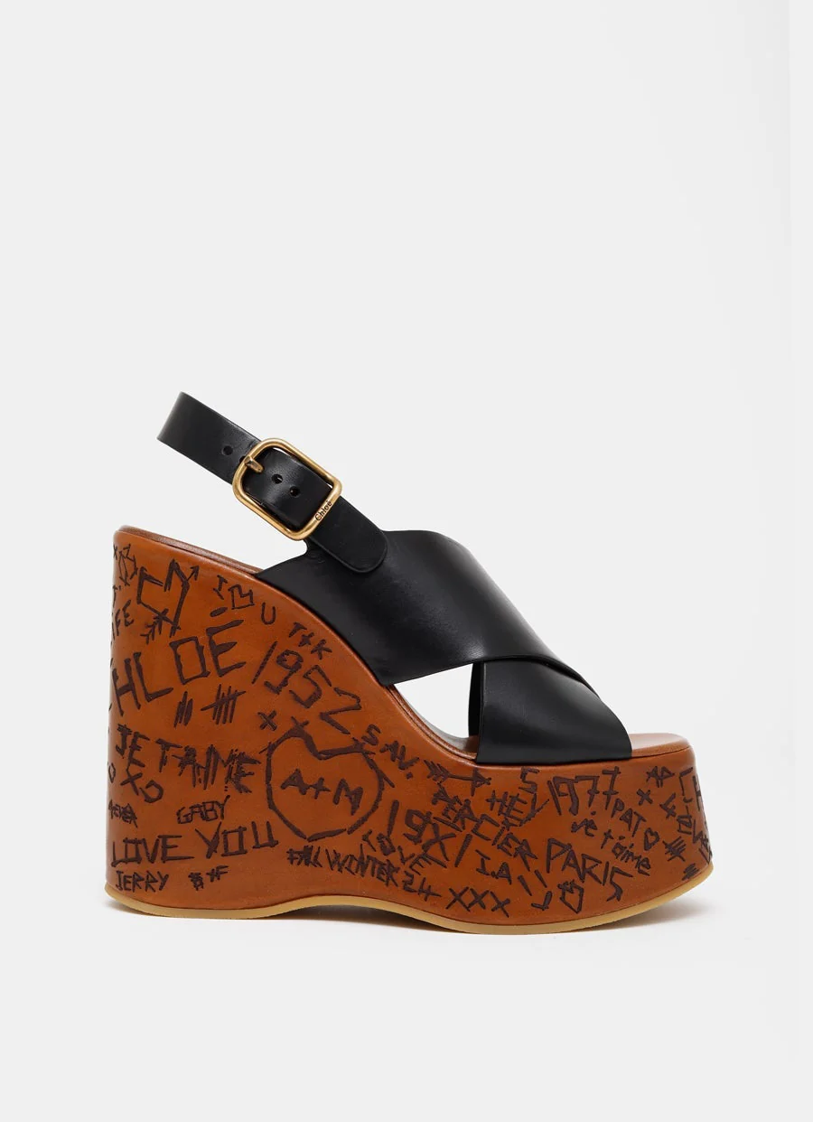 Sandalia de Chloé en piel con empeine de tiras cruzadas, puntera abierta, tira ajustable con hebilla dorada y cuña de 9.5 cm. Hecha en Italia. Talla normal, elige tu talla habitual. Tallaje italiano.