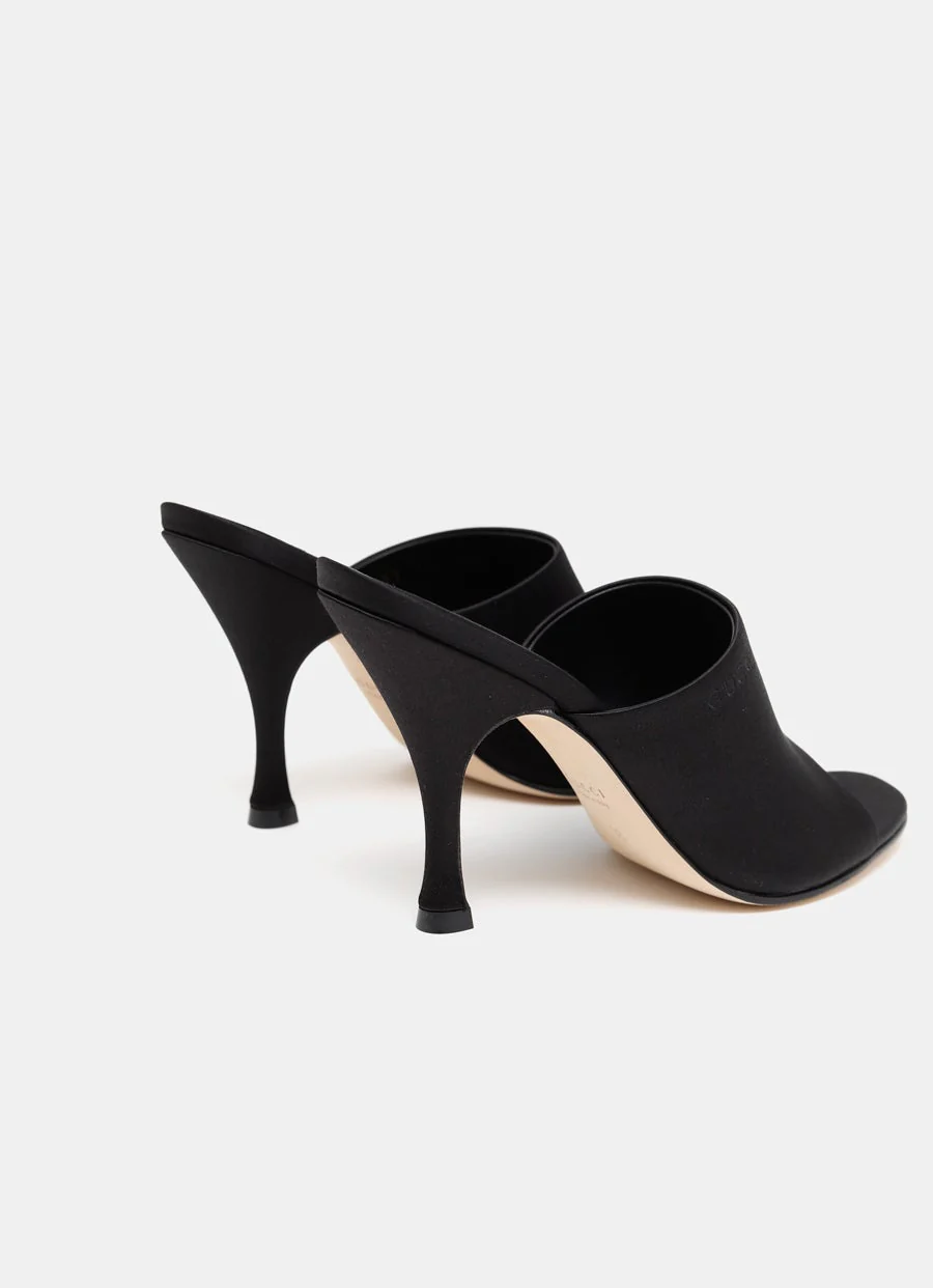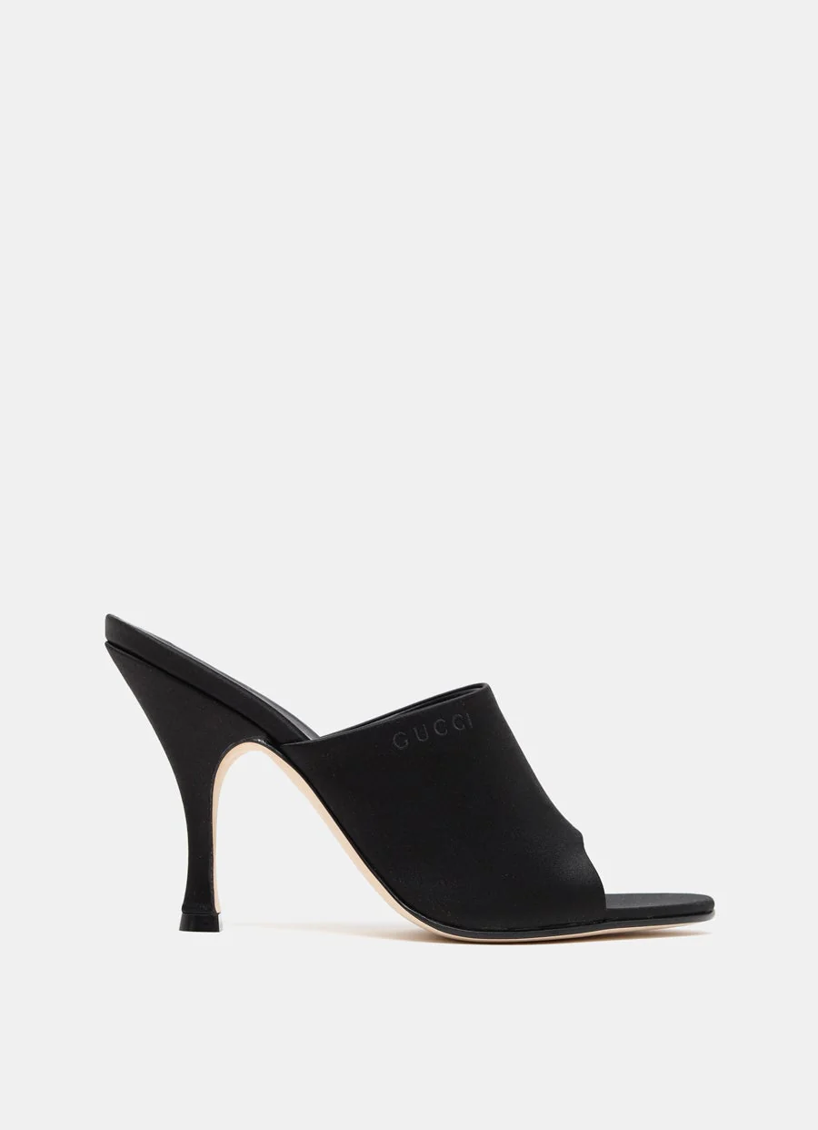 Sandalia de Gucci de puntera abierta y con tac贸n de aguja en sat茅n. Suela y forro de piel, logotipo de Gucci en relieve en la parte superior, y tac贸n de 95 mm. Hecha en Italia. Talla normal, elige tu talla habitual. Tallaje italiano para mujer.