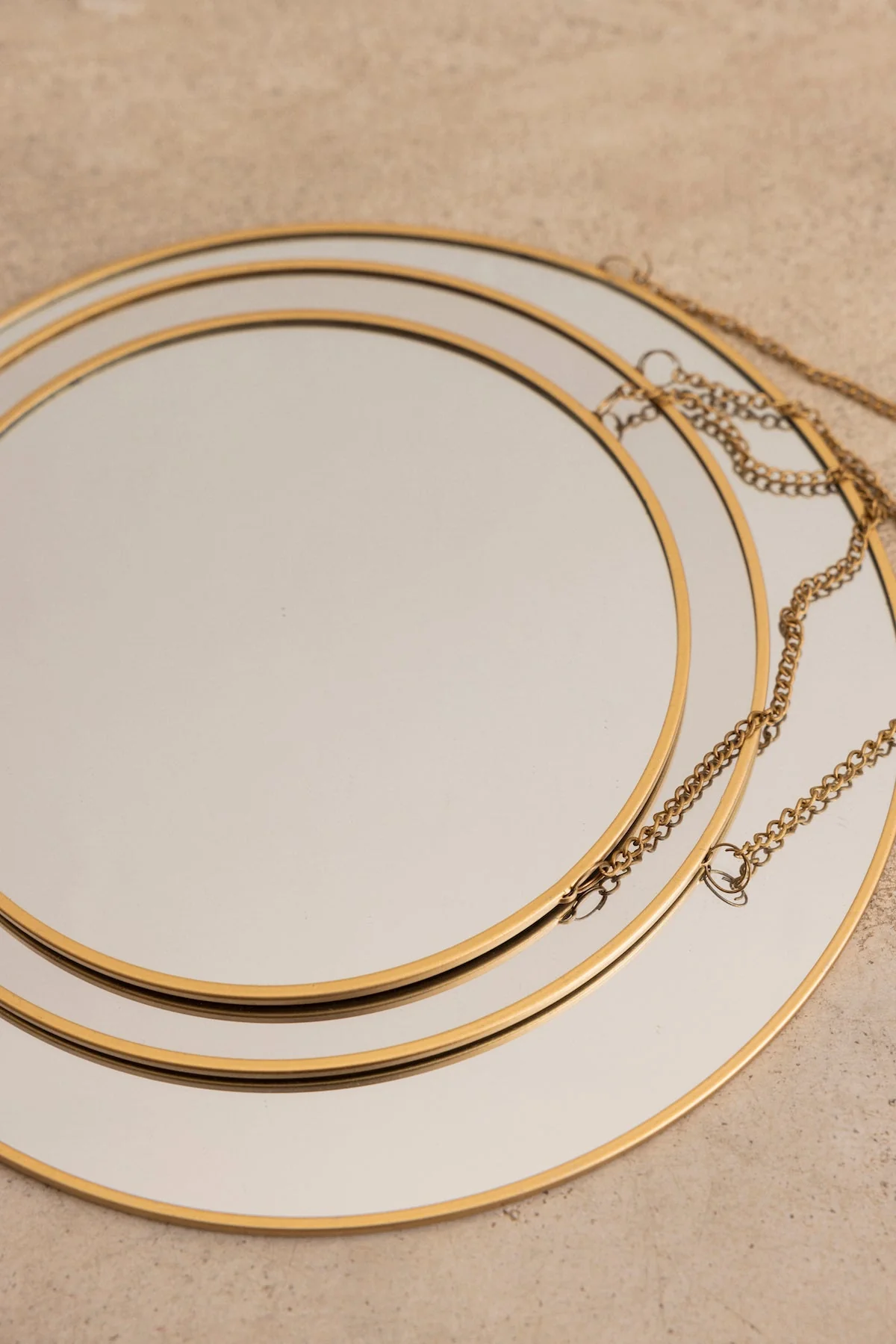 Conjunto de 3 espejos de pared met谩licos en forma circular con cadenas para colgar.
