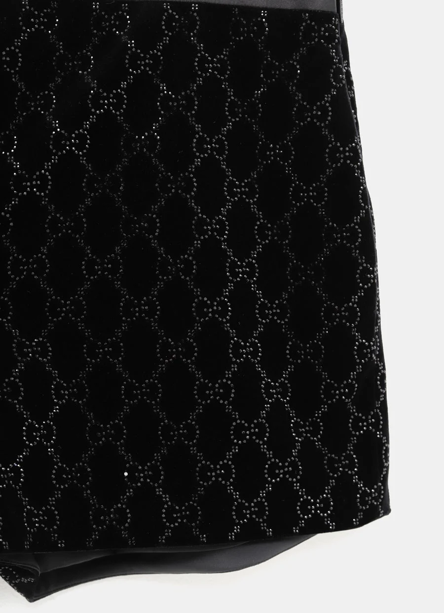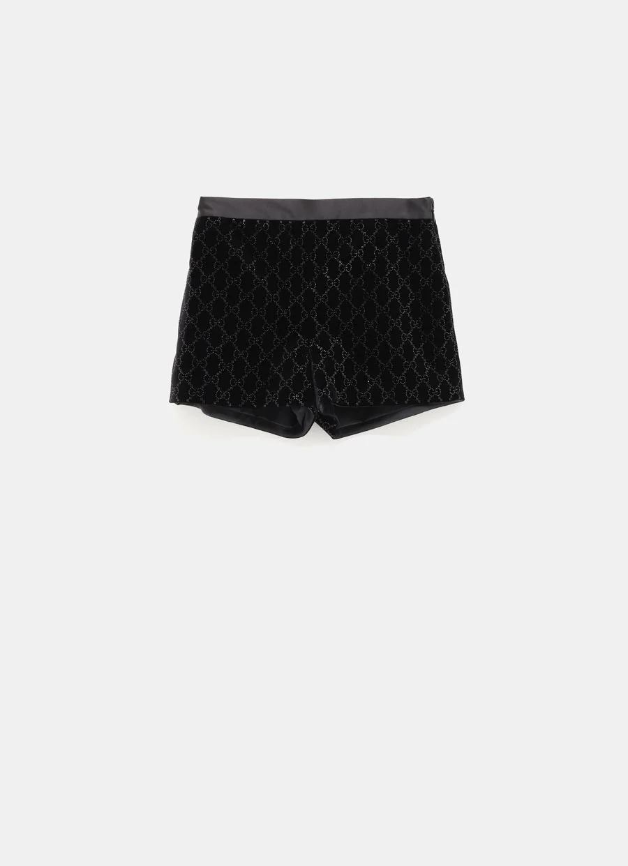 Shorts de Gucci en terciopelo suave con estampado integral de logotipo y detalles en cristal. Cinturilla de sat茅n, bolsillos laterales y cierre de cremallera lateral. Totalmente forrado. Hecho en Italia. Talla normal, elige tu talla habitual. Tallaje UE para mujer.