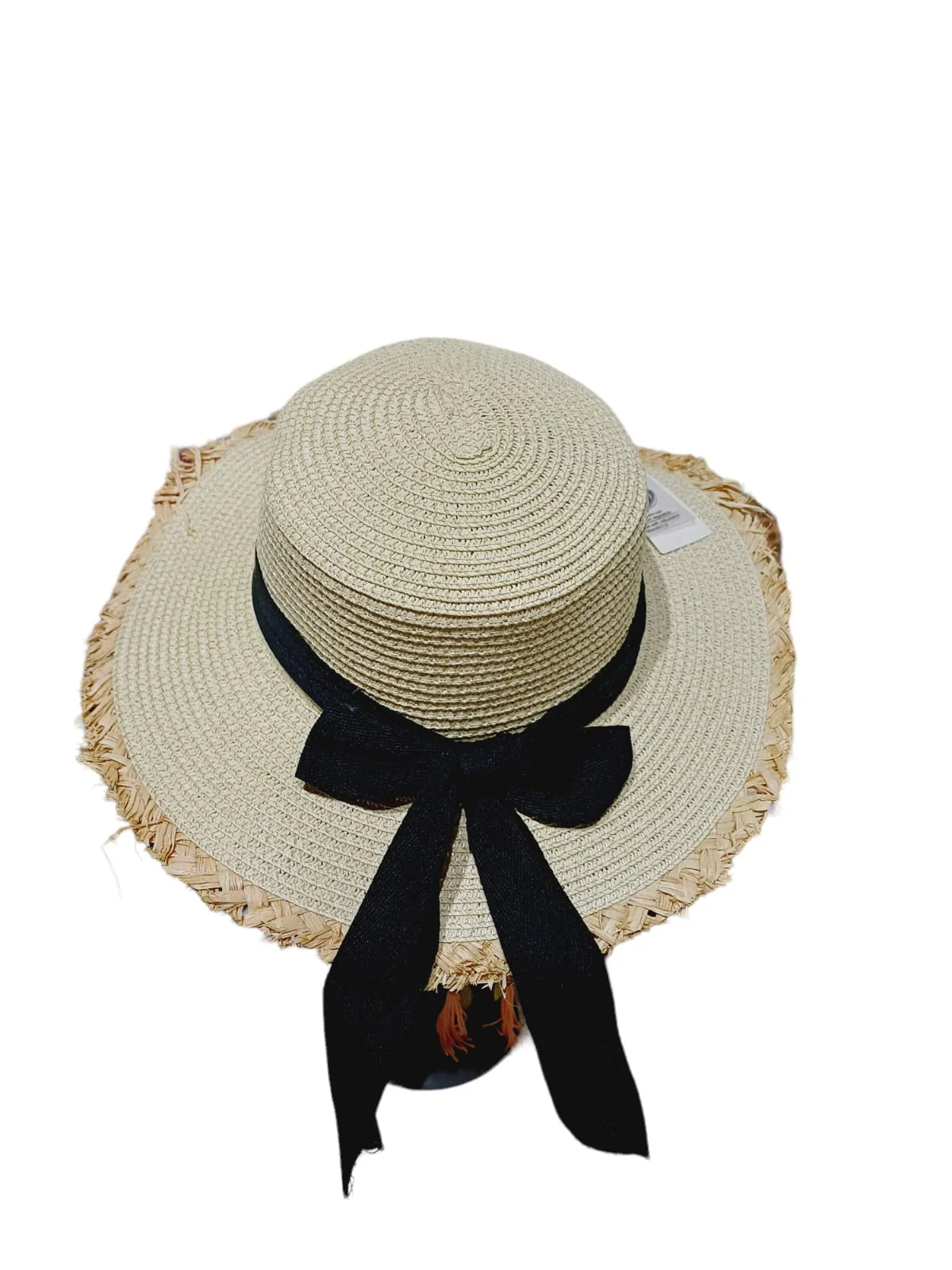 Sombrero beige tejido con detalle de flecos al borde y una chonga de liston negro.