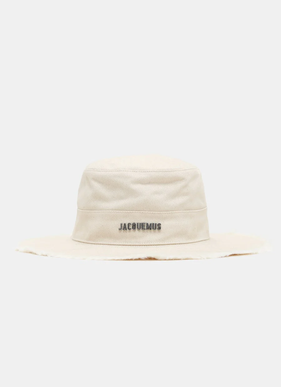 Sombrero safari de Jacquemus con logo metálico en la parte frontal, cordón trasero ajustable, ala ancha con borde deshilachado y detalle de costura. Elegir circunferencia en cm en el selector de tallas.