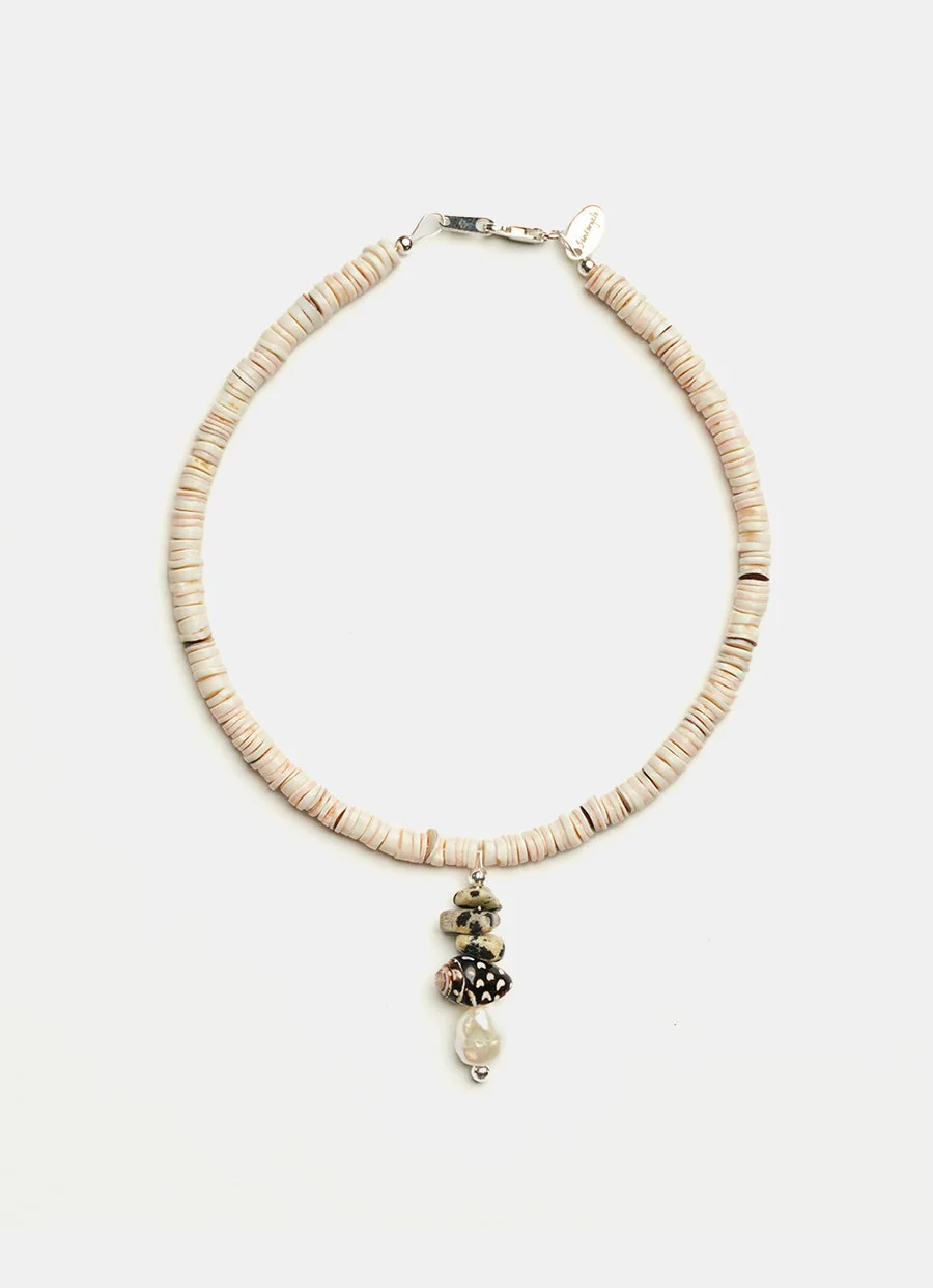 Tobillera de Santangelo en concha heishi, jaspe dálmata, perla de agua dulce, concha de pireno y plata de ley. Cierre de mosquetón y 24cm de largo. Elaborada artesanalmente con elementos naturales, cada pieza es única, ya que no hay dos iguales. Hecho en USA.